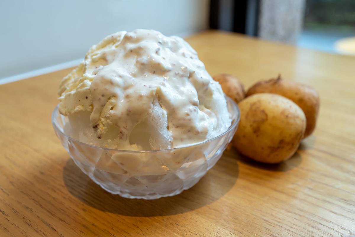 เมนูแรกที่อยากจะแนะนำคือ น้ำแข็งไสรสเบค่อนโปเตโต้ (770 เยน) เป็นเมนูน้ำแข็งไสที่หักล้างแนวความคิดที่ว่าน้ำแข็งไสคือขนมหวาน เบคอนส่งตรงจากเมืองอิโตชิมะ (Itoshima) จังหวัดฟุกุโอกะ ตัวซอสจะมีส่วนผสมหลักเป็นมันฝรั่งออร์แกนิคที่ปลูกในจังหวัดชิบะและครีมชีสจากฮอกไกโด เสริมรสชาติด้วยครีมสด เกลือ พริกไทย มัสตาร์ด และน้ำมันมะกอก