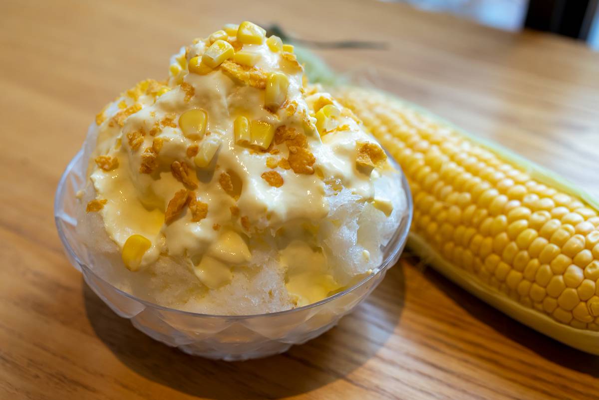น้ำแข็งไสรสข้าวโพด (770 เยน) เมนูนี้จะมีจุดเด่นคือ ความหอมหวานอ่อนๆ โดยกลิ่นหอมหวานธรรมชาตินี้ได้มาจากการใช้ข้าวโพดที่เติบโตตามฤดูกาลนั่นเอง ราดด้วยครีมซอสที่ทำมาจากครีมสดและข้าวโพดบด ท็อปปิ้งด้วยคอร์นเฟลกและเมล็ดข้าวโพดต้ม แค่เห็นภาพก็ได้กลิ่นข้าวโพดหอมๆ ลอยออกมาแล้ว