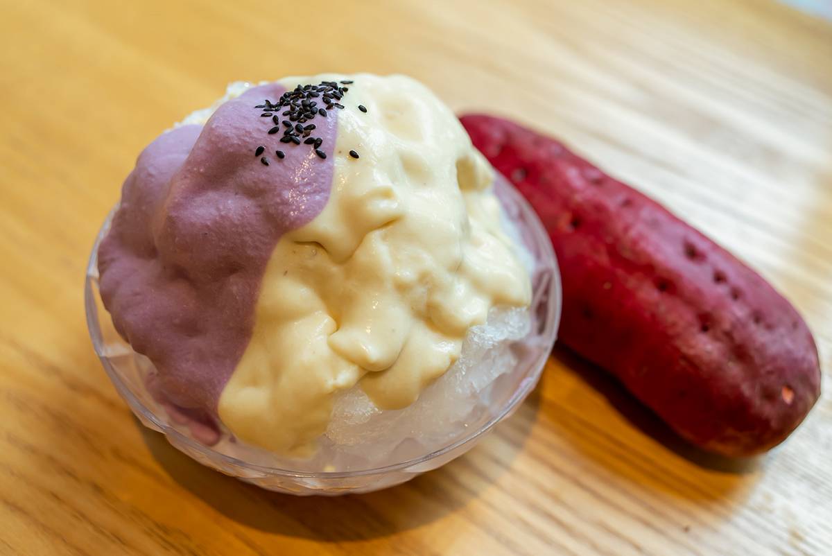 และเมนูสุดท้ายที่อยากจะแนะนำคือ น้ำแข็งไสรสมันหวานญี่ปุ่นวีแกน (770 เยน) เป็นเมนูที่ใช้มันหวานโทซาเบนิ (Tosabeni) ของดีประจำฤดูร้อน ราดด้วยครีมที่มีส่วนผสมหลักเป็นน้ำถั่วเหลืองและมัน 2 สี (มันหวานและมันม่วง) สอดไส้น้ำแข็งไสด้วยมันหวานบด ปิดท้ายด้วยการโรยงาดำด้านบน