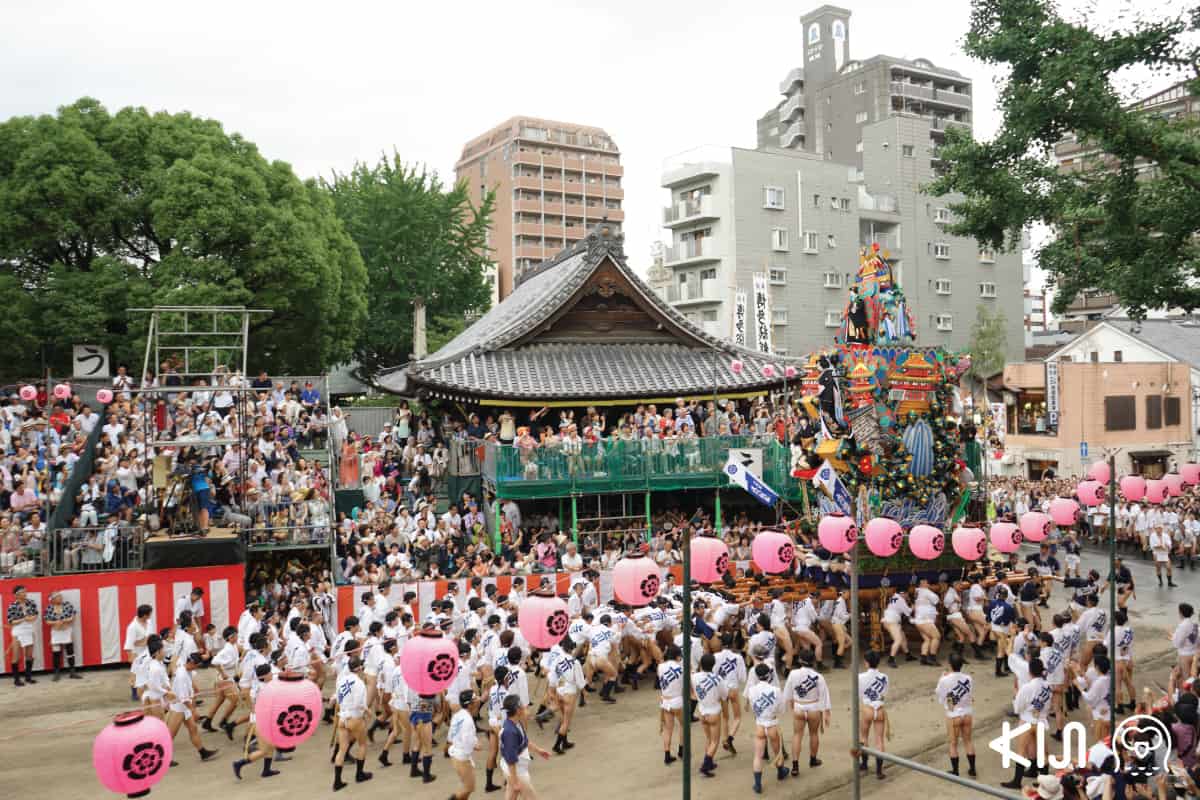 วันนั้นตรงกับวันที่ 15 กรกฎาคมในปฏิทินสากล สำหรับชาวฟุกุโอะกะช่วงเช้ามืดของวันที่ 15 ในทุกๆ ปี จะมีพิธีปิดเทศกาลฮาคาตะ กิออน ยามาคาซะ (Hakata Gion Yamakasa Festival) จัดขึ้นที่ลานโล่งตรงกลางศาลเจ้า ที่ใช้คำว่า ‘ปิดเทศกาล’ เพราะงานนี้เขาเริ่มจัดกันมาตั้งแต่วันที่ 1 กรกฎาคมเลย คือจะมีการแข่งขันขบวนแห่จาก 7 ทีมที่มาจาก 7 ชุมชน ในย่านฮากาตะ ฉันเองได้มาดูช่วงซ้อมแข่งไปครั้งหนึ่งเมื่อ 3-4 วันก่อนด้วย ตอนนั้นซ้อมแข่งกันช่วงบ่ายอากาศร้อนจี๊ด คล้ายกับว่า ดวงอาทิตย์ที่หลายคนเชื่อว่าเป็นสัญลักษณ์ของความรุ่งโรจน์ ได้ทำหน้าที่อย่างขยันขันแข็ง