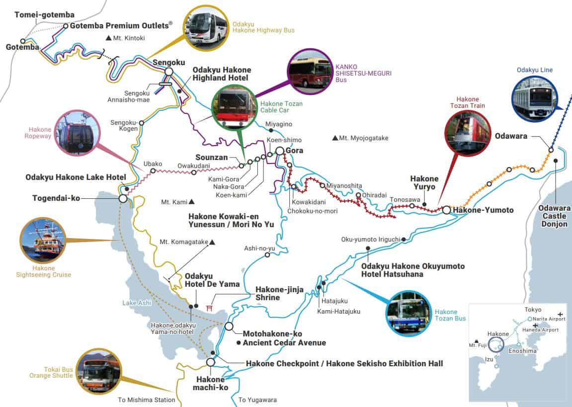 ด้วยความที่มีธรรมชาติให้ชมหลากหลาย ส่งผลให้ขนส่งสาธารณะก็มีหลากหลายประเภทให้เลือกใช้บริการด้วย ทั้งรถราง รถไฟ เรือ กระเช้า รถบัส ได้แก่ Hakone Tozan Train, Hakone Tozan Bus, KANKO SHITETSU-MEGURI Bus, Hakone Tozan Cable Car, Hakone Ropeway, Hakone Sightseeing Cruise, Odakyu Hakone Highway Bus, Tokai Bus Orange Shuttle ทั้งหมดที่กล่าวมานี้สามารถใช้ Hakone Free Pass ขึ้นได้ทั้งหมด