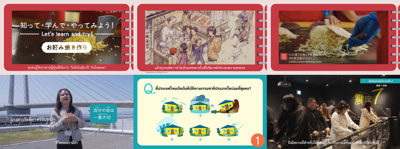 รูปแบบที่ 2 เป็นวิดีโอในแนวคิด “เรียนรู้และลองทำดู!” (Let’s Learn and Try) ซึ่งเป็นการแนะนำวัฒนธรรมญี่ปุ่นผ่านวิดีโอสั้น ๆ สำหรับชุดแรก เราได้ผลิตวิดีโอออกมาแล้ว 2 ตอน คือ “โอโคโนมิยากิ” (พิซซ่าสไตล์ญี่ปุ่น) และ “การป้องกันภัยพิบัติ”