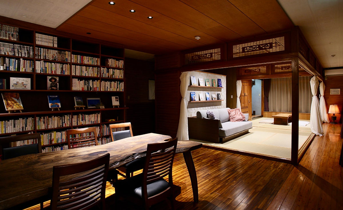 สิ่งที่ต้องตกตะลึงเมื่อเข้าไปด้านในบ้านพักแห่งนี้ก็คือ ชั้นหนังสือที่มีหนังสืออยู่ประมาณ 1,500 เล่ม จัดวางไว้ตามมุมต่างๆ อย่างสวยงาม บอกเลยว่าสำหรับใครที่ชื่นชอบการอ่านหนังสือ ที่นี่คือสวรรค์ของเหล่านักอ่านเลยทีเดียว หนังสือก็มีหลากหลายประเภท ไม่ว่าจะเป็นหนังสือภาพ นวนิยาย หนังสือวิชาการ หนังสือต่างประเทศ มังงะ ฯลฯ นอกจากนี้ยังมีบริการคัดเลือกหนังสือที่ช่วยแนะนำหนังสือให้กับผู้ที่สนใจเป็นจำนวน 3 เล่ม สำหรับใครที่มาแล้วไม่รู้ว่าจะอ่านเล่มไหนดีก็สามารถใช้บริการนี้ได้เลย