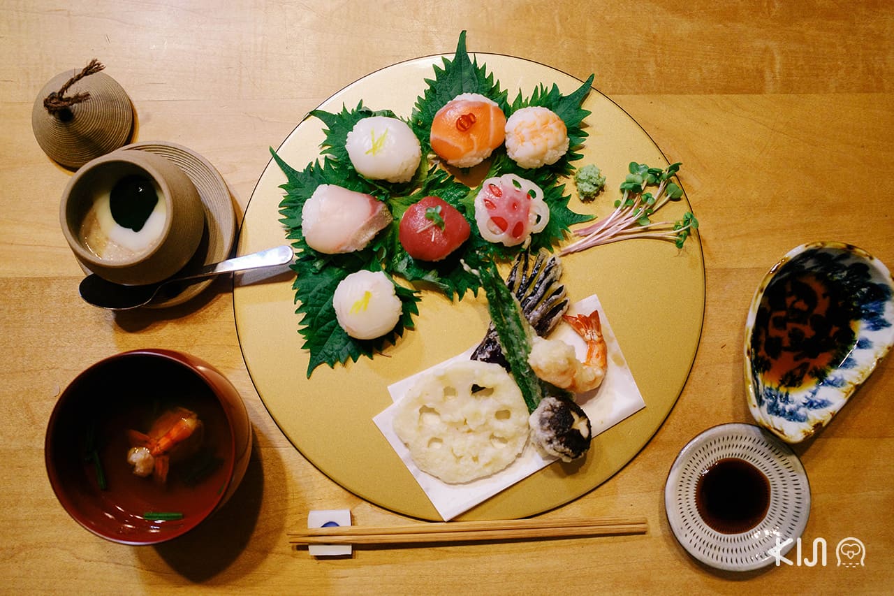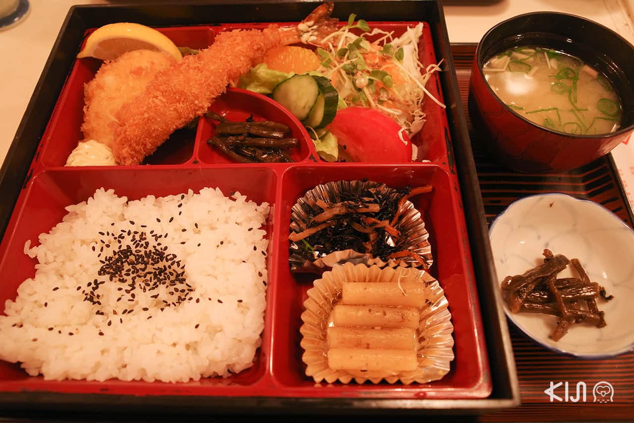 ร้าน Kineya ไม่ได้มีแค่อาหารเช้าและขนมหวานเท่านั้น ยังมีชุดอาหารกลางวันหลากหลายให้สั่ง สามารถนั่งรับประทานได้ที่ชั้น 2 เราสั่งชุดอาหารกลางวันชุดใหญ่ ที่มาครบทั้งกุ้งเทมปุระ ปลาย่าง ข้าวญี่ปุ่น เครื่องเคียง ผลไม้ ซุปมิโซะ และของหวาน อิ่มแน่นพุง