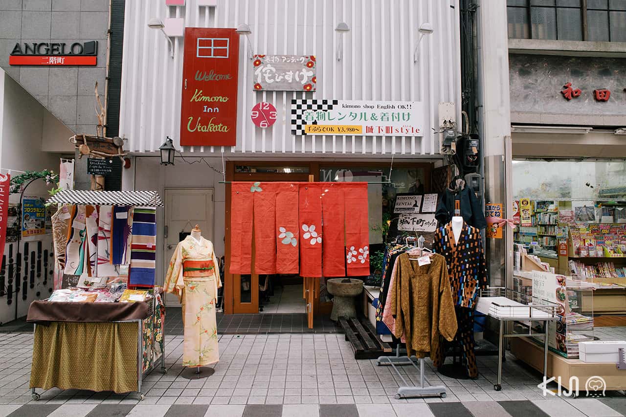 มิชชั่นของฉันอีกหนึ่งอย่างในการมา ‘ฮิเมจิ’ ก็คือจะต้องแต่งชุดกิโมโนให้ได้! ที่เมืองฮิเมจิมีร้านเช่าชุดกิโมโนเรียงรายอยู่หลายร้าน ฉันเลือกเดินเข้าร้าน Jyoka Machi Style เพราะชุดกิโมโนสีสวยหน้าร้านดึงดูดฉันได้อยู่หมัด ด้านในมีผ้าหลากสีแขวนเรียงรายทั่วร้าน เจ้าของร้านเริ่มแต่งชุดและทรงผมให้ฉันด้วยความเชี่ยวชาญ ไม่นานฉันก็รู้สึกว่าเนื้อสัมผัสของผ้าและทรงของชุดทำให้ฉันรู้สึกเหมือนเป็นส่วนหนึ่งของเมืองนี้ไปซะแล้ว