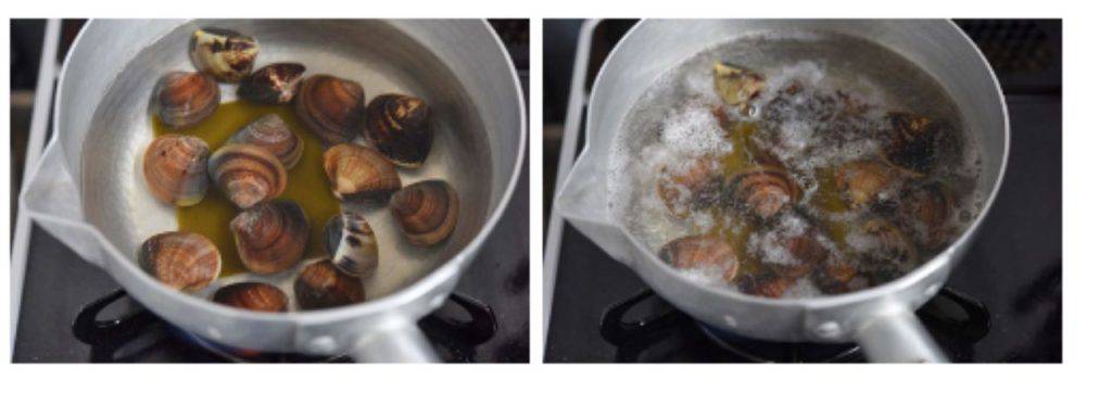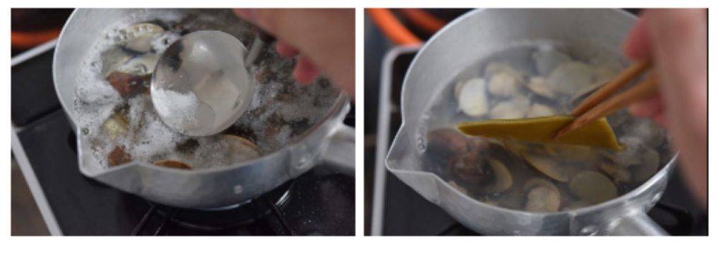 - เติมน้ำในหม้อ 500 มล. แล้วใส่สาหร่ายคอมบุ 1 แผ่น จากนั้นเทหอยตลับที่ล้างเสร็จแล้วลงไป ทริคคือการเริ่มต้นด้วยน้ำเย็นก่อน แล้วจึงค่อยๆ เพิ่มความร้อนขึ้นอย่างช้าๆ ระวังอย่าให้ไฟแรงมากเกินไป