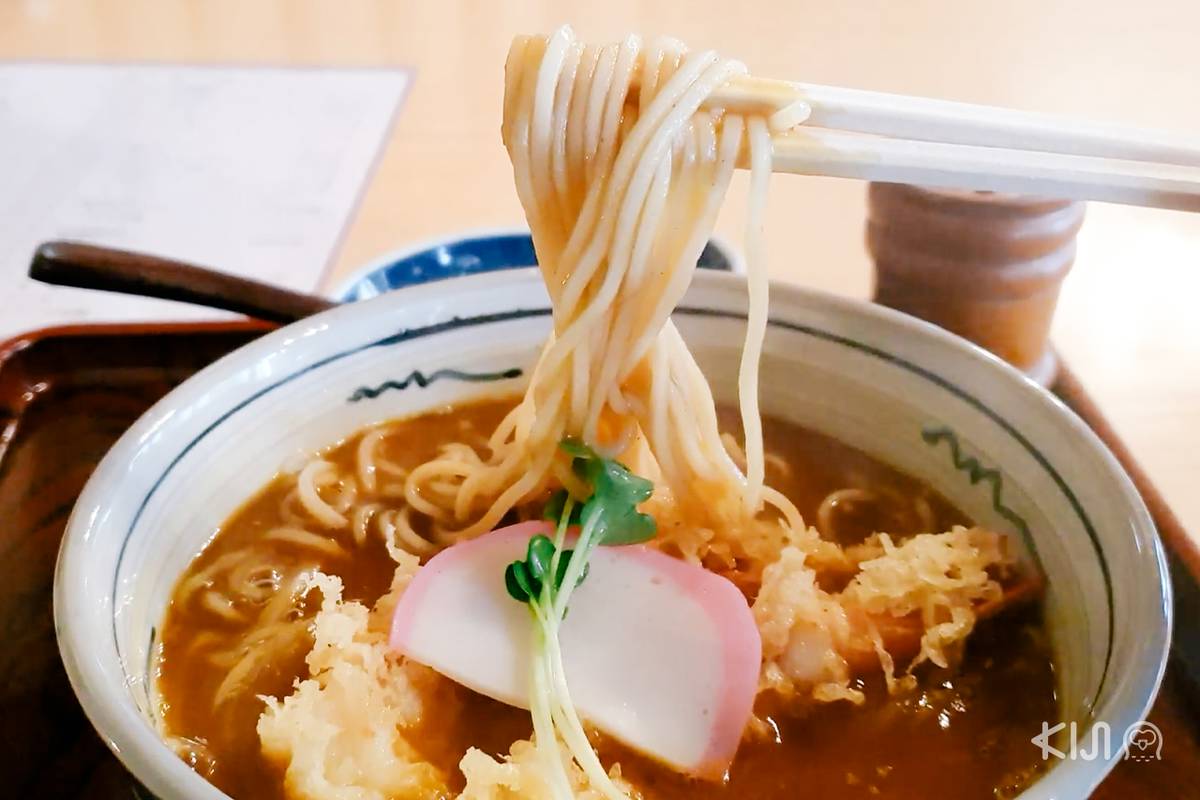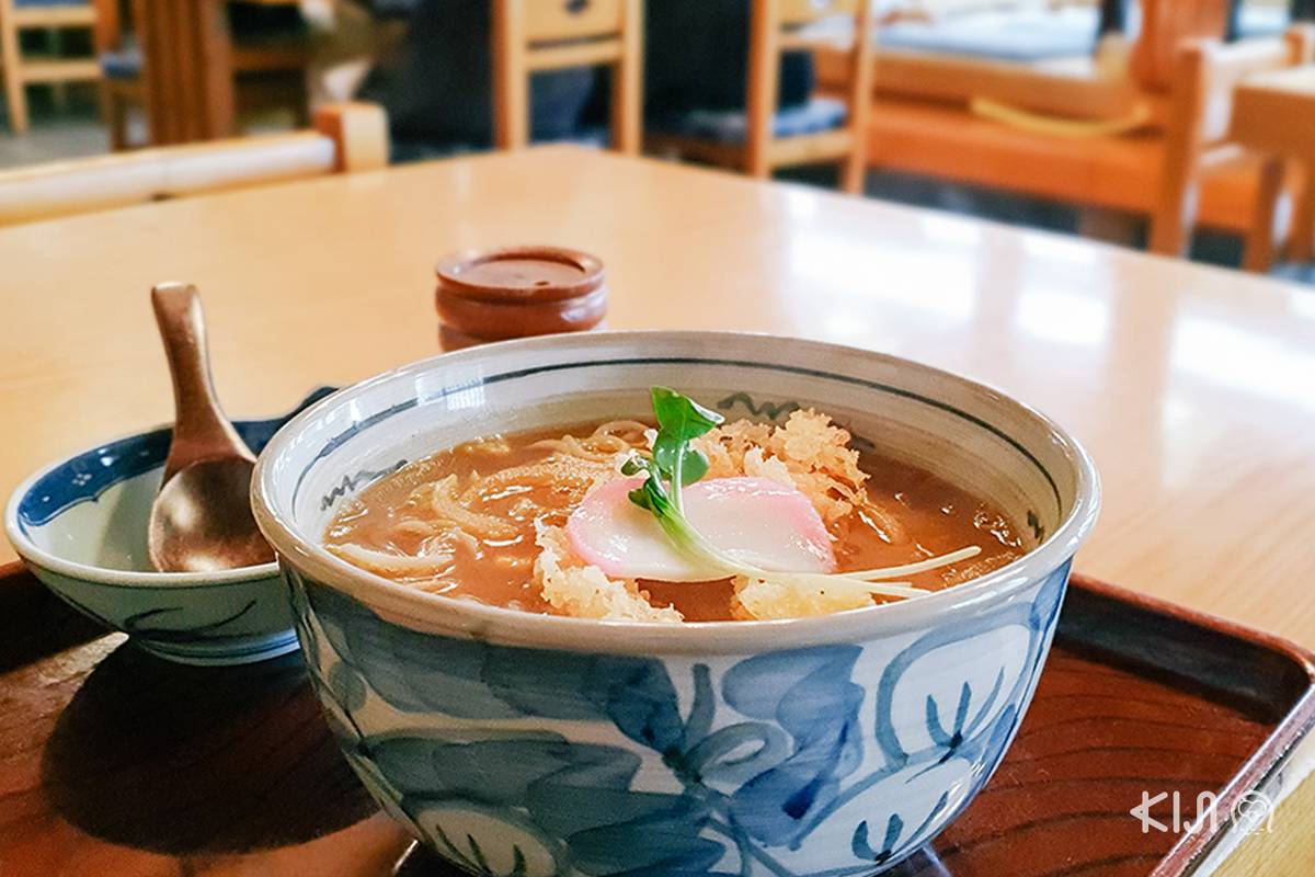 เมนูขึ้นชื่อคือ เท็นคาเรโซบะหรือโซบะแกงกะหรี่โปะด้วยเทมปุระ น้ำซุปเข้มข้นมาก แต่ไม่ข้นเกินกว่าจะซด เข้ากันได้ดีกับเส้นโซบะแบบจีนที่ดูดซับรสเครื่องแกงไว้ได้ดีเยี่ยม กินสลับกับเทมปุระกรอบๆ อร่อยลงตัวสุดๆ ใครไม่ชอบกุ้งจะสั่งเป็นหมูทอดหรือหมูชาชูก็ได้ นอกจากนี้เขายังมีราเมนธรรมดาและข้าวหน้าหมูทอดขายด้วยสำหรับคนที่ไม่รับประทานแกงกะหรี่