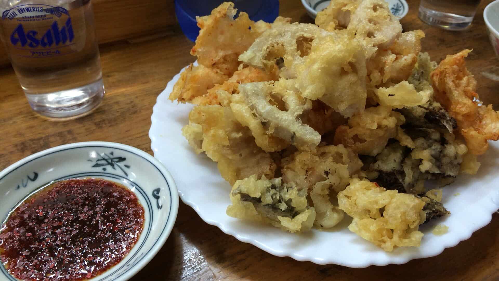 ถึงคิวเมนูชุบแป้งทอดแต่อาจจะแปลกซะหน่อย นั่นก็คือ โฮรุมงเทมปุระ หรือ เครื่องในชุบแป้งทอด ซึ่งถ้ารู้ประวัติความเป็นมาอาจจะรู้สึกไม่ค่อยอยากกิน เพราะฉะนั้นเลื่อนข้ามไปก็ได้ แต่ถ้าใครอยากรู้ เราก็จะบอกว่าเมื่อก่อนแถวฮิโรชิม่านี่แหละเป็นแหล่งโรงเชือดสัตว์ จึงมีการนำเครื่องในที่เอาไปทำประโยชน์ไม่ค่อยได้มาชุบแป้งทอดกิยกันมาหลายยุคสมัย