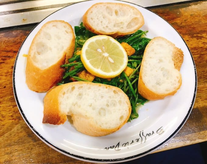 พักเมนูบ้านๆ มาลองเมนูที่เพิ่งเกิดขึ้นมาไม่กี่ปีกันบ้าง นี่ก็คือ อุนิกับผักสลัดน้ำ หรือภาษาญี่ปุ่นเรียกว่า อุนิคุเรซง ซึ่งนำไข่หอยเม่นมาผัดเนยคลุกกับใบวอเตอร์เครส หรือที่เรียกกันว่า “สลัดน้ำ” เสิร์ฟคู่กับขนมปังบาแกตต์ เกิดเป็น อาหาร ฮิโรชิม่า ที่ใช้ของดีจากท้องทะเลมารังสรรค์เป็นเมนูสมัยใหม่
