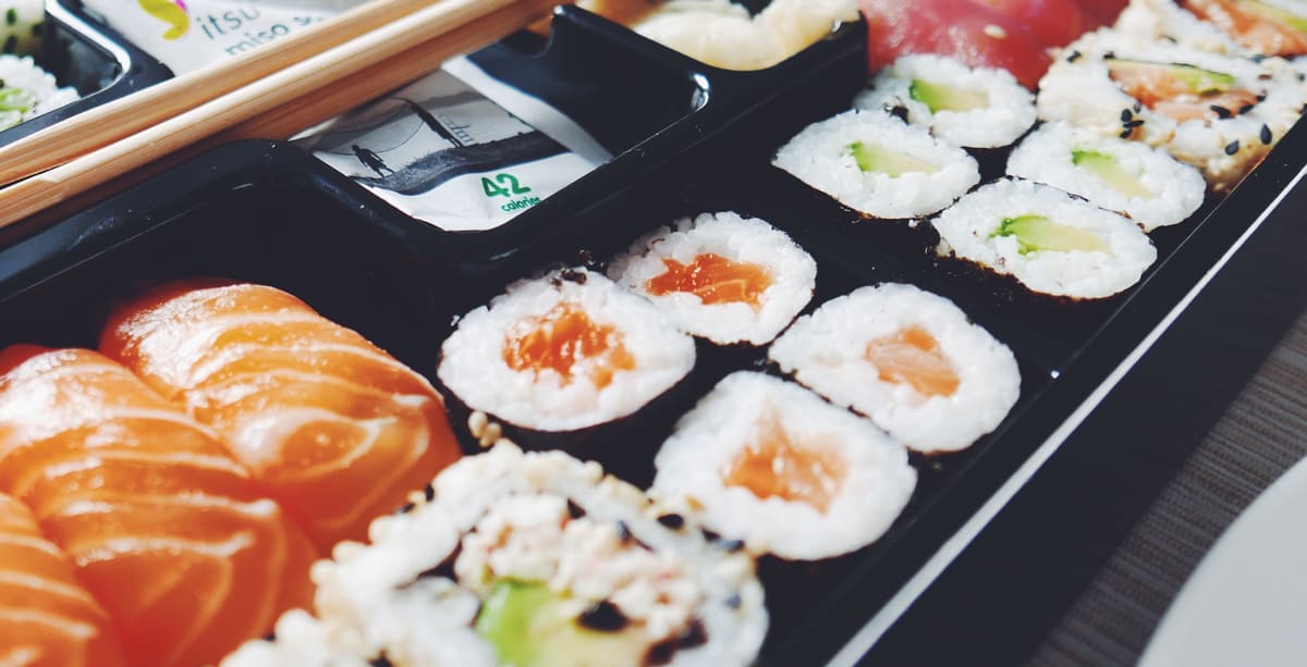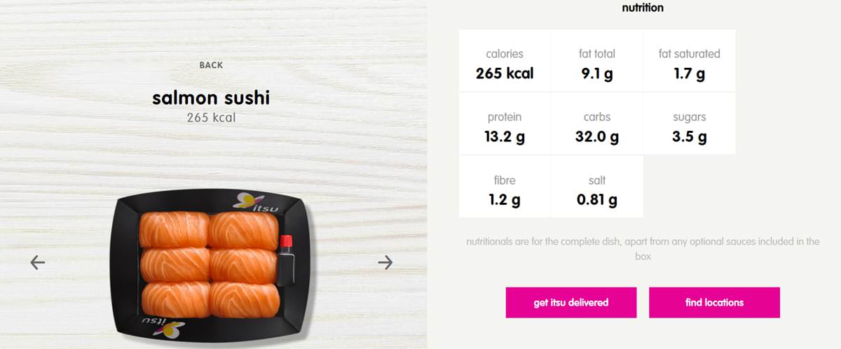 ซูชิแซลมอน 6 ชิ้น (265 kcal/ โปรตีน 13.2g/ น้ำตาล 3.5g/ ไฟเบอร์ 1.2g/ ไขมันอิ่มตัว 1.7g ฯลฯ)