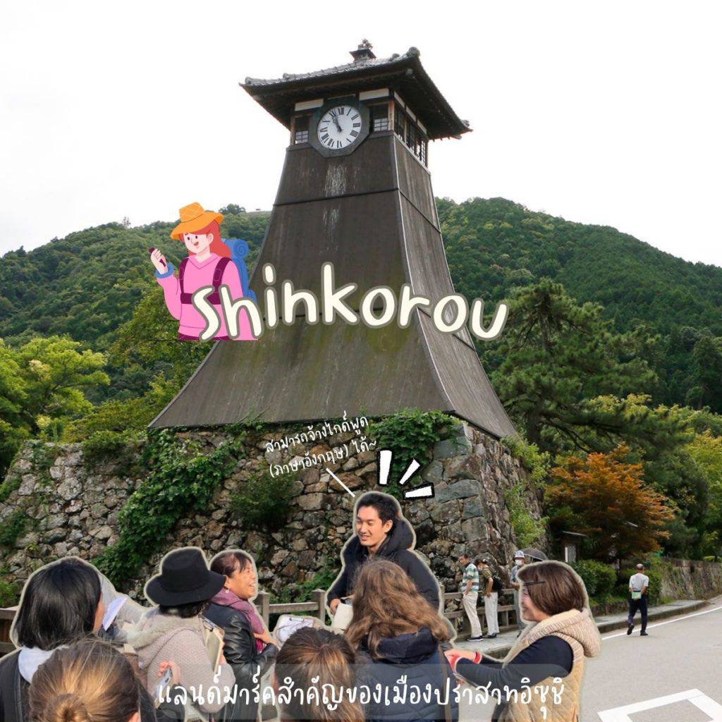พอเดินเข้ามาในบริเวณเมืองปราสาทอิซุชิ ก็จะเห็นหอนาฬิกาสีดำคลาสสิกตั้งเด่นเป็นสง่าอยู่ท่ามกลางธรรมชาติที่สวยงาม หอนาฬิกานี้มีชื่อว่า “ชินโคโระ (Shinkorou)”จุดนี้ถือเป็นแลนด์มาร์คที่สำคัญของเมืองปราสาทอิซุชิเลยก็ว่าได้ เพราะเป็นหอนาฬิกาที่เก่าแก่ที่สุดเป็นอันดับสองในญี่ปุ่น สร้างขึ้นในปี ค.ศ.1871 หินบริเวณที่ตั้งหอนาฬิกาแห่งนี้เป็นหินชนิดเดียวกับที่ใช้สร้างปราสาท Izushi นอกจากตัวหอนาฬิกานี้จะตั้งอยู่ใกล้ๆ กับย่านร้านค้าแล้ว เรายังสามารถมองเห็นวิวภูเขาที่อยู่ด้านหลังหอนาฬิกาได้ด้วย เดิมทีหอนาฬิกาแห่งนี้เป็นหอสังเกตการณ์ข้าศึก ที่ซึ่งภายในจะมีห้องเอาไว้สำหรับลั่นกลอง ในอดีตกลองจะตีเพื่อเรียกผู้คนไปที่ปราสาทเพื่อทำงาน หรือเป็นการส่งสัญญาณให้ทุกคนในเมืองทราบทั่วกันว่าเวลาทำงานได้เริ่มขึ้นแล้ว โดยจะมีการลั่นกลองเพื่อบอกเวลาทุกๆ 1 ชั่วโมง และในวันพิเศษอย่างวันรำลึก Izushi Time ก็เปิดให้นักท่องเที่ยวเยี่ยมชมด้านในหอนาฬิกาได้
