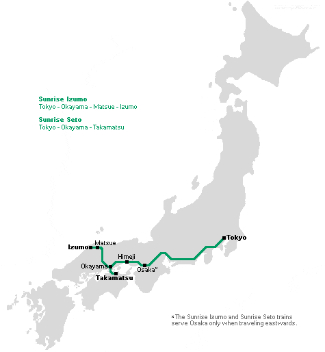 โดย Sunrise Izumo มุ่งหน้าไปยังปลายทางเมืองอิซุโมะ (Izumo) จังหวัดชิมาเนะ (Shimane) ขณะที่ Sunrise Seto มุ่งหน้าไปยังเมืองทาคามัตสึ (Takamatsu) จังหวัดคางาวะ (Kagawa) รถออกทุกวันเวลา 22:00 น. จากสถานี Tokyo Station หากออกเดินทางจากโตเกียวไปสถานีเมืองอิซุโมะใช้เวลาประมาณ 12 ชั่วโมง ระยะทาง 954 กม. และหากไปสถานีเมืองทาคามัตสึใช้เวลาประมาณ 9 ชั่วโมงครึ่ง ระยะทาง 805 กม.