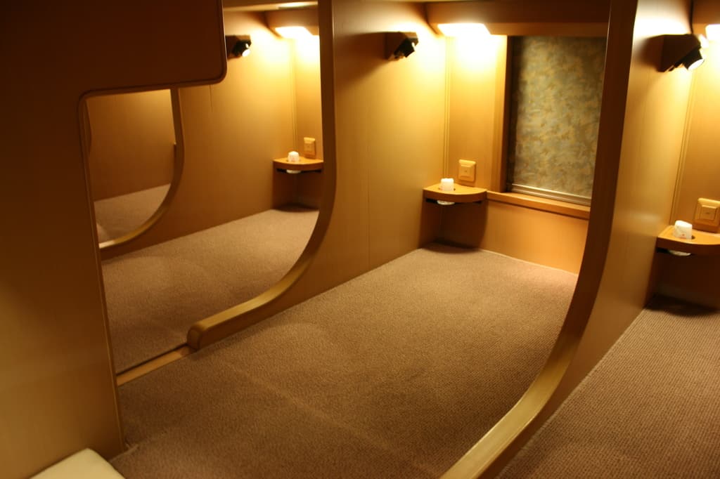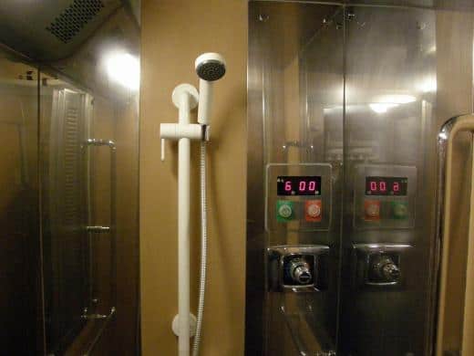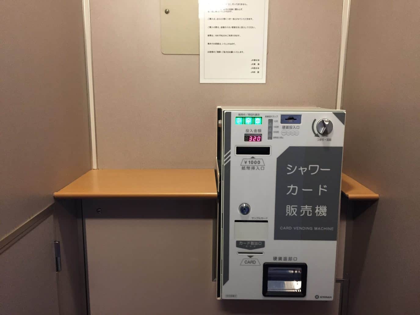 เอาล่ะ เมื่อขึ้นมาบนรถไฟกันแล้ว! นอนข้ามคืนแบบนี้ไม่ต้องห่วง เพราะมีห้องอาบน้ำให้ (เสียเงินแยกต่างหาก) อย่างไรก็ตามจุดที่ต้องระวังคือ ต้องซื้อบัตรอาบน้ำก่อน ซึ่งมีอยู่จำนวนจำกัดพอสมควร เมื่อขึ้นรถมาแล้วควรรีบซื้อเลย รวมถึงต้องเตรียมผ้าเช็ดตัวมาเอง (มีแต่สบู่, แชมพู และเครื่องเป่าผมให้) อีกทั้งเป็นห้องอาบน้ำแบบมีเวลาจำกัดเพียงแค่ 6 นาที (320 เยน) เมื่อเสียบบัตรสำหรับอาบน้ำแล้วเวลาจะนับถอยหลัง เมื่อหมดเวลาน้ำจะหยุดไหลทันที ระวังอย่าอาบเพลินนะครับ ฮ่าๆ