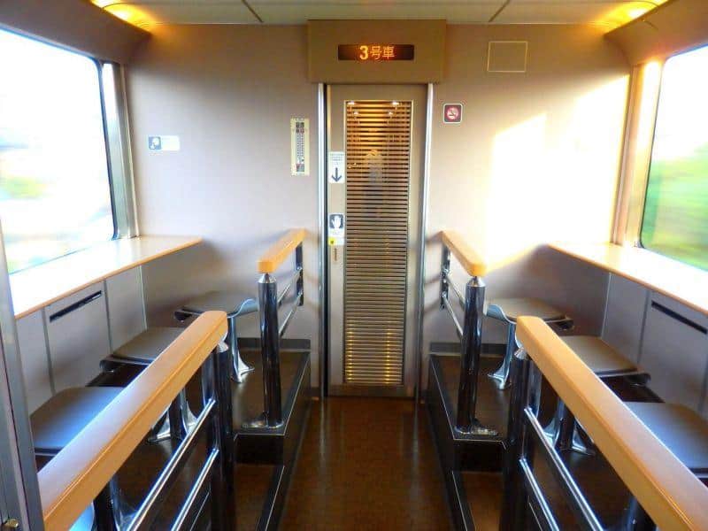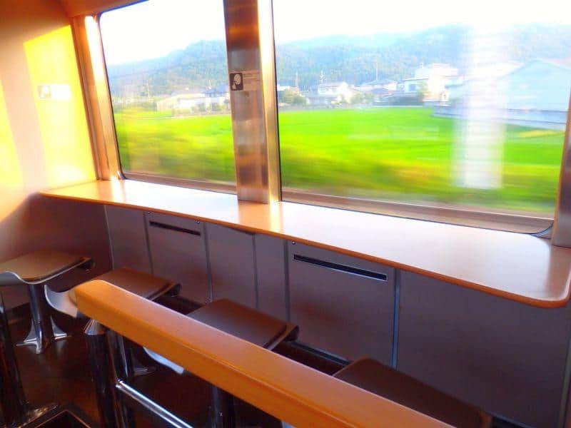 เมื่อตื่นเช้าขึ้นมาจะมีตู้ Lounge พร้อมเคาเตอร์บาร์ติดริมหน้าต่างใหญ่ให้เรานั่งรับประทานอาหารเช้าได้ น่าเสียดายที่บนรถไม่มีบริการเสิร์ฟอาหารใดๆ แต่ยังดีที่มีตู้กดน้ำอัตโนมัติพอช่วยชีวิตได้บ้าง จึงขอแนะนำให้ซื้อเอคิเบนอาหารกล่องตั้งแต่ก่อนขึ้นรถไฟ กินพร้อมชมวิวตามรายทางไปฟินสุดๆ เนื่องจาก Sunrise เป็นรถไฟที่วิ่งไม่เร็วมาก เราจึงสามารถซึมซับวิวทิวทัศน์ระหว่างทางได้เต็มที่ อีกทั้งเรายังสามารถพบปะหรือพูดคุยกับเพื่อนร่วมทางใหม่ๆ ทาง Lounge นี้ได้ด้วยนะ