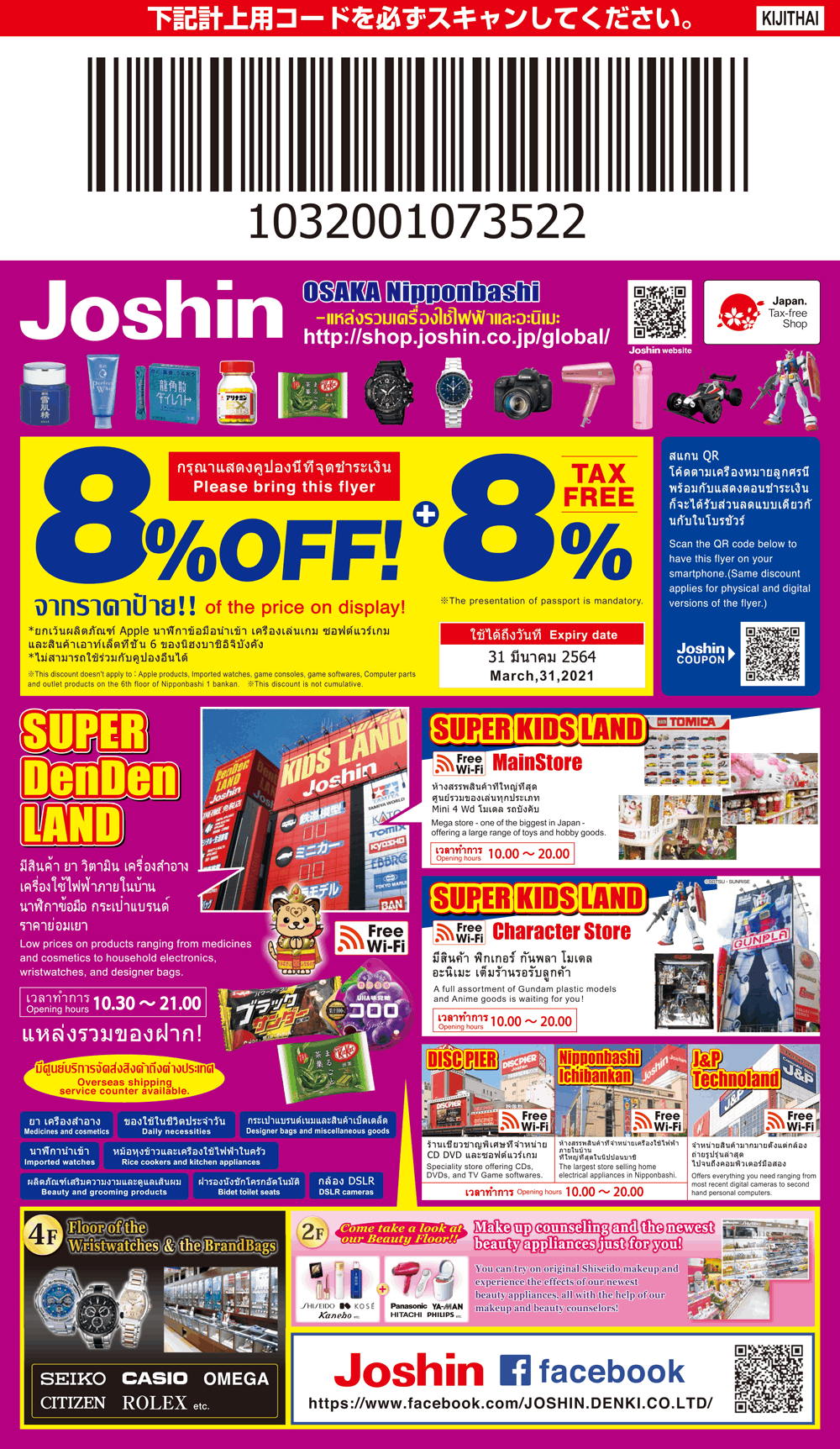 ก่อนอื่นเลย คิจิมีคูปองส่วนลดสำหรับใช้ที่โจชินทั้ง 6 สาขาในย่าน DENDEN TOWN OSAKA NIPPONBASHI ที่จะแนะนำในลำดับถัดไป เมื่อคุณซื้อสินค้าครบ 5,000 เยนขึ้นไป และแสดงบาร์โค้ดด้านบนคูปองนี้ที่แคชเชียร์ ก็สามารถใช้ลดราคาได้สูงสุด 18% จากราคาป้าย 8% จากราคาปลอดภาษีอีก 10% หมดเขต 30 มิถุนายน พ.ศ. 2564