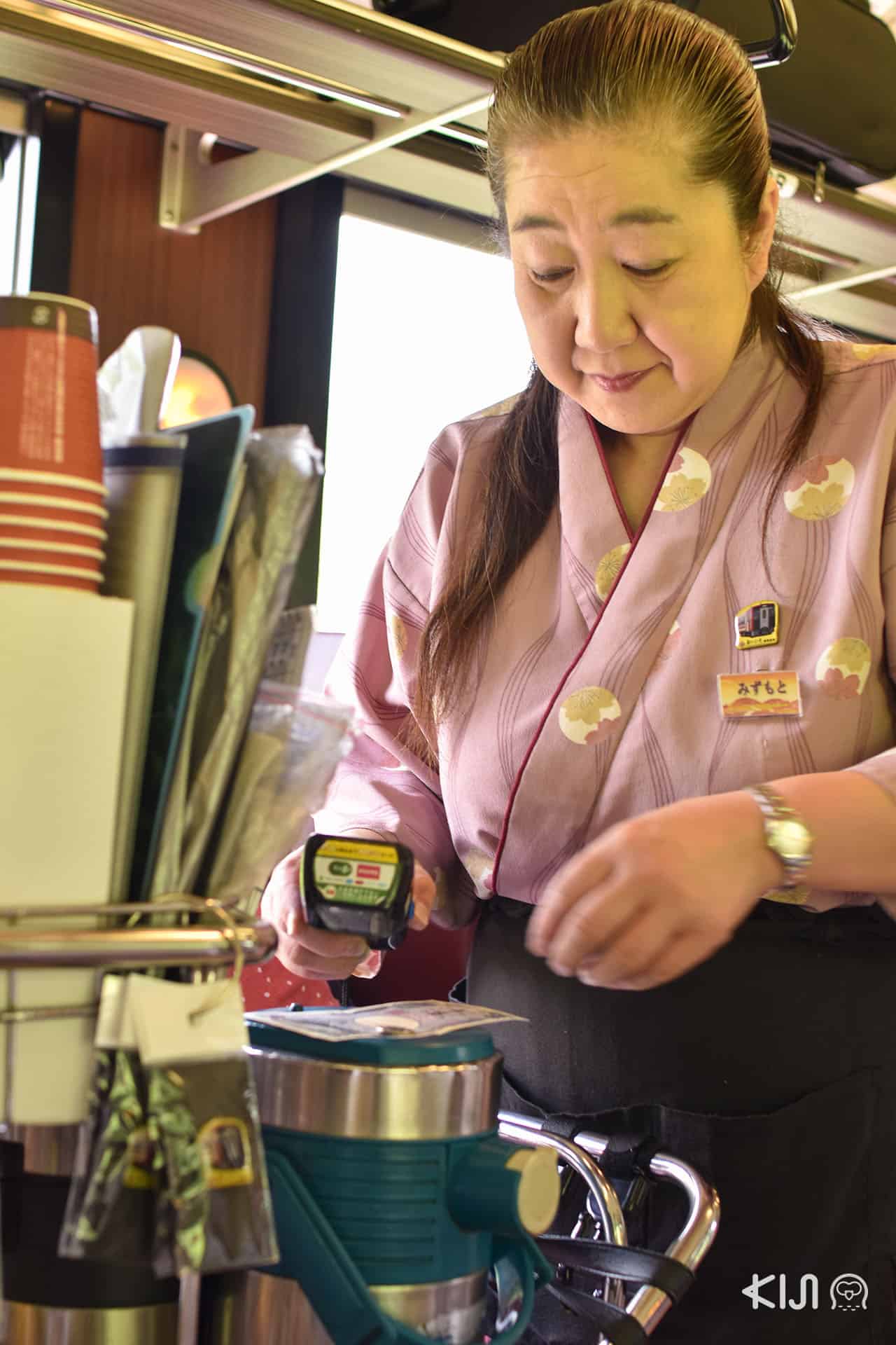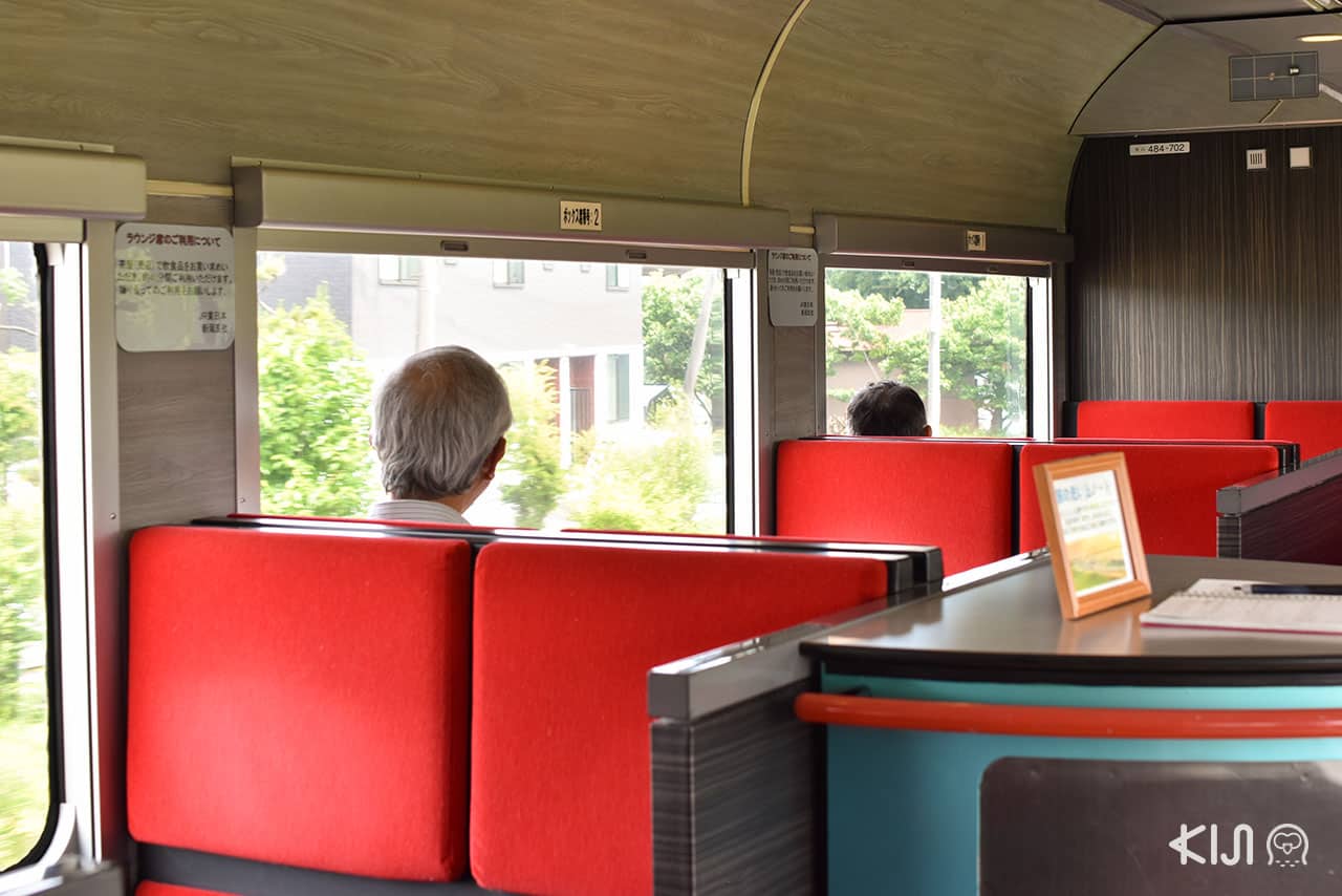 ภายในรถไฟถูกออกแบบให้ฟิลลิ่งเหมือนได้นั่งอยู่ในห้องนั่งเล่นของคุณยาย ทั้งในขบวนยังมีคุณป้าหน้าเปื้อนยิ้มคอยดูแลเราอยู่ตลอดเส้นทาง รวมถึงทุกคนที่โดยสารจะได้รับผักดองโนซาวานะ (Nozawana) จากมือของคุณป้ามาให้ได้ลองชิมรสชาติกัน