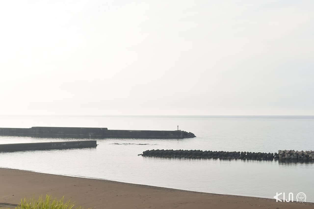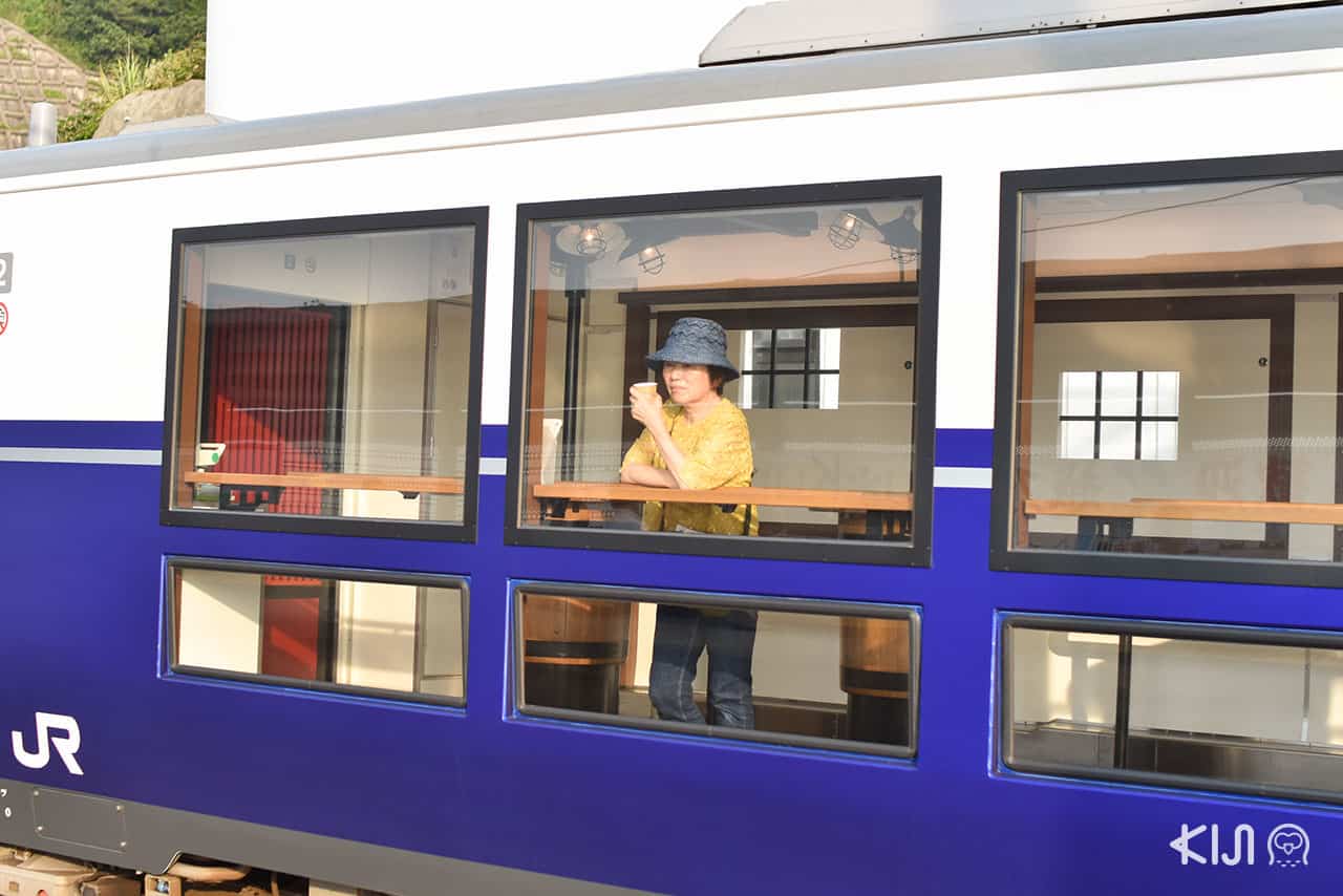 ขบวนของ Koshino Shu*Kura จะจอดพัก ณ สถานี Omigawa ที่ขึ้นชื่อว่าเป็นสถานีรถไฟที่ใกล้ทะเลที่สุดในญี่ปุ่น ประมาณ 15 นาที ให้เราได้ลงไปดื่มด่ำกับวิวทะเลแบบใกล้ชิด หรือใครที่ชอบเซลฟี่ที่นี่ก็มีพร็อพเป็นหมวกประจำตำแหน่งพนักงานขับรถไฟให้สวมเพื่อถ่ายรูป