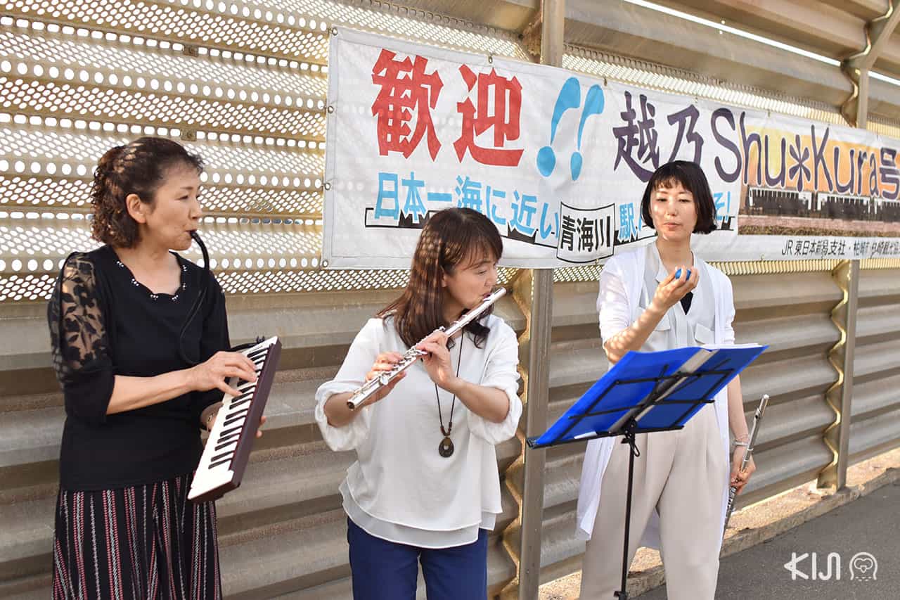 กับสถานี Hotaka จะแตกต่างจากสถานีอื่นๆ สักหน่อยตรงที่มีหญิงสาวทำงานในศาลเจ้า (หรือในอีกชื่อหนึ่งคือมิโกะ) มารอต้อนรับและนำทางเราเดินเท้าไปยังศาลเจ้าโฮตากะ (Hotaka Shrine) ขณะที่รถไฟจะจอดเทียบรอ ณ ชานชาลาราวๆ 30 นาที ก่อนที่ขบวนนี้จะออกตัวไปพร้อมๆ กับมีการแสดงสดจากอาสาสมัครท้องถิ่นที่มาร้องเพลงแนวโฟล์คซองและบรรเลงดนตรีพื้นบ้านญี่ปุ่นเพราะๆ คลอไปจนถึงสถานี Shinano-Omachi เลยทีเดียว