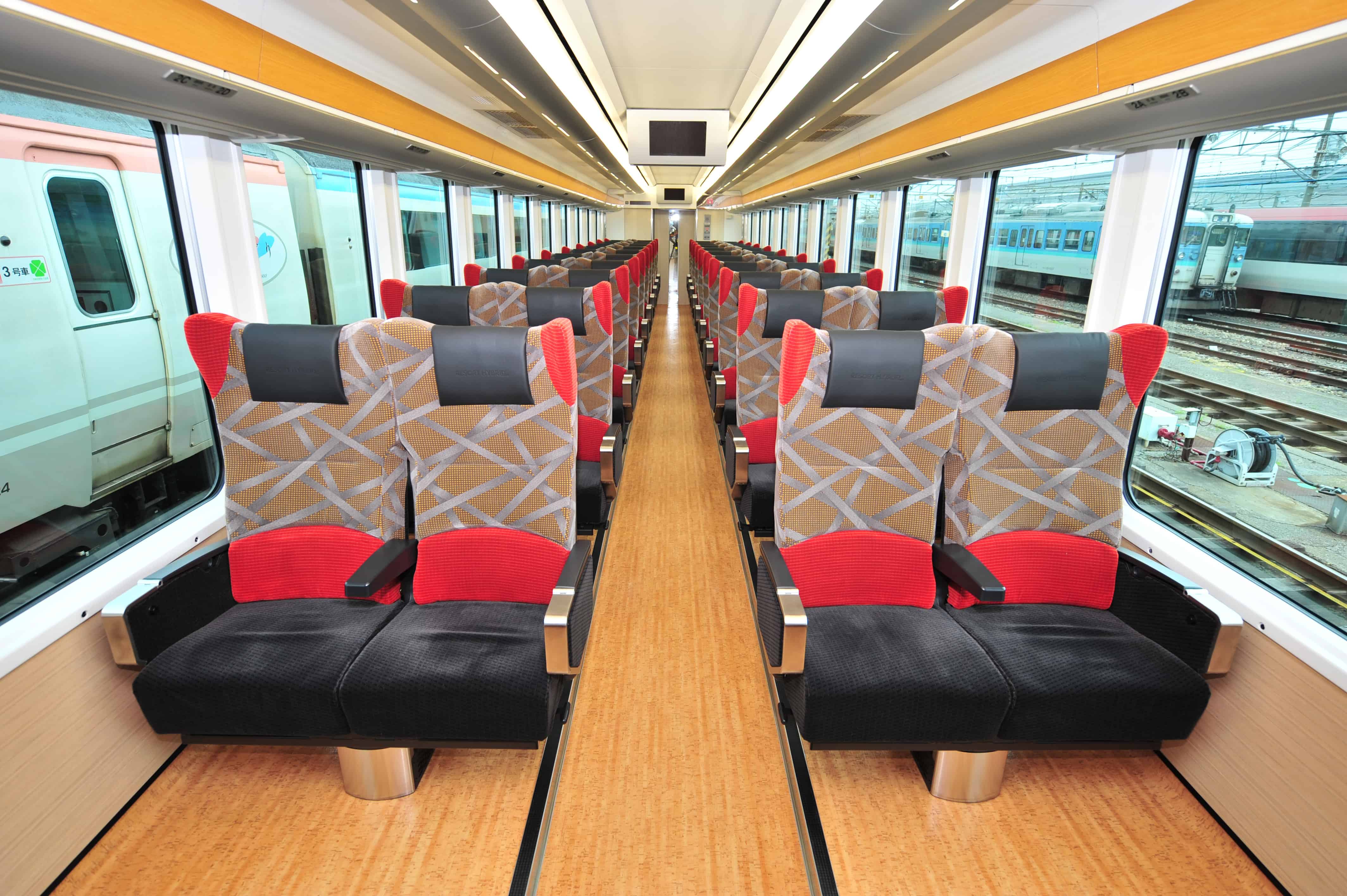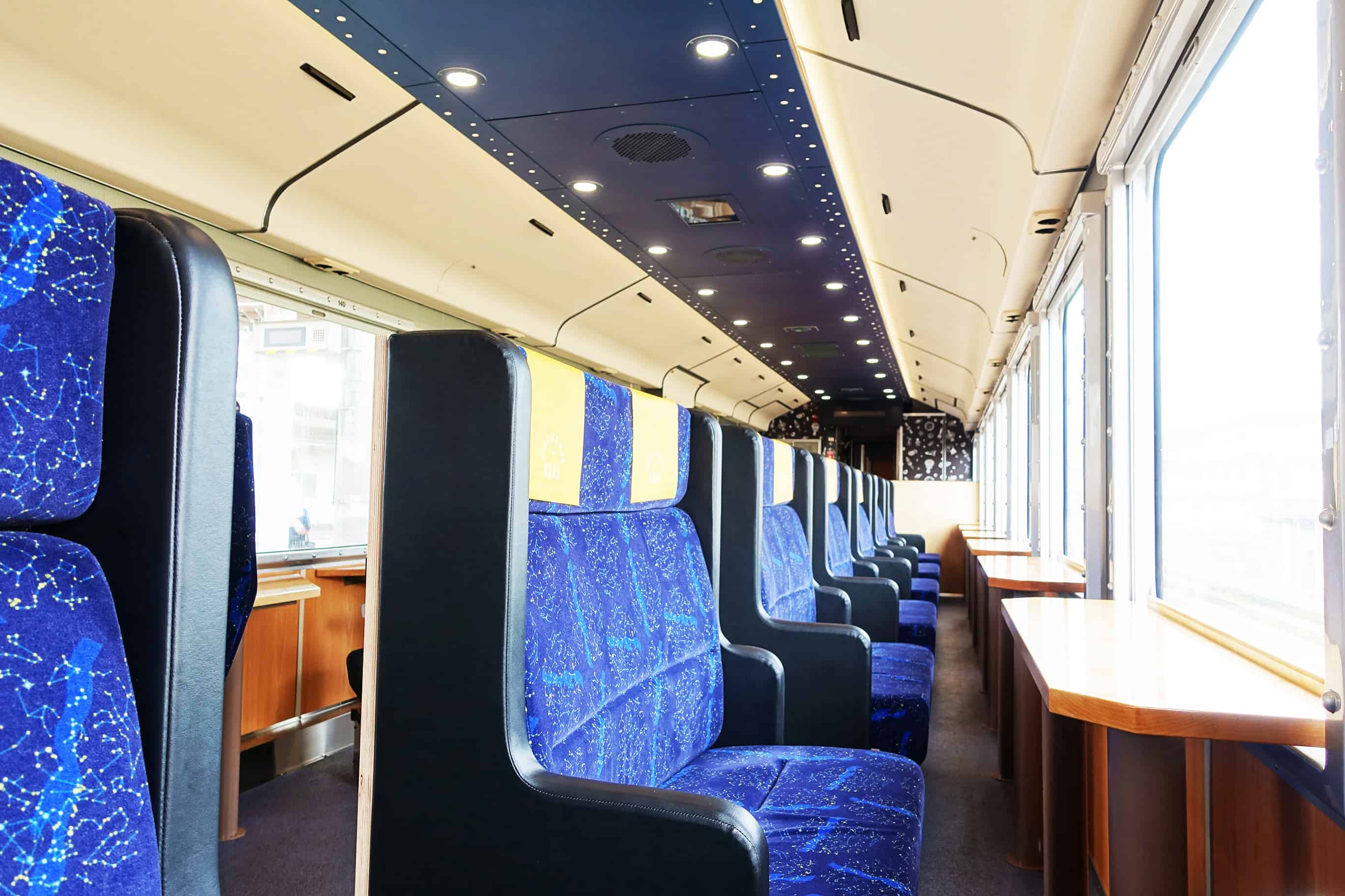 แพทเทิร์นแปลกตาสีเหลืองสดใสของเบาะที่นั่งแบบที่ต้องสำรองล่วงหน้าในขณะที่โซฟาไว้สำหรับผู้โดยสารที่ไม่ได้จองที่นั่งเอาไว้ กับอีกตู้โดยสารที่เปิดให้เป็นพื้นที่สำหรับเด็กได้สนุกสนานไปกับรถไฟของเล่นโดยมีสตาฟคอยดูแลความปลอดภัย