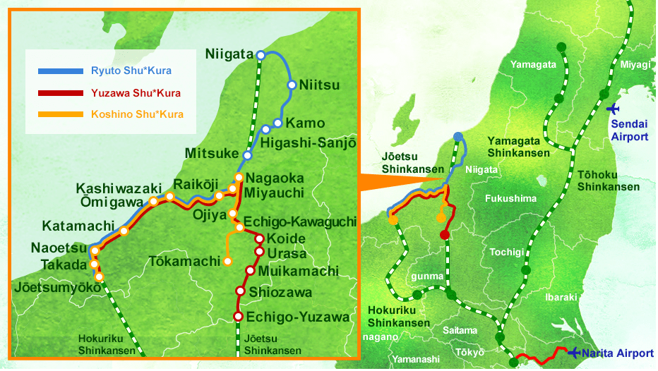 Route : เส้นทาง Koshino Shu*Kura ระหว่างสถานี Joetsumyoko ถึง Tokamachi, เส้นทาง Ryuto Shu*Kura ระหว่างสถานี Joetsumyoko ถึง Niigata และเส้นทาง Yuzawa Shu*Kura ระหว่างสถานี Joetsumyoko ถึง Echigo-Yuzawa
