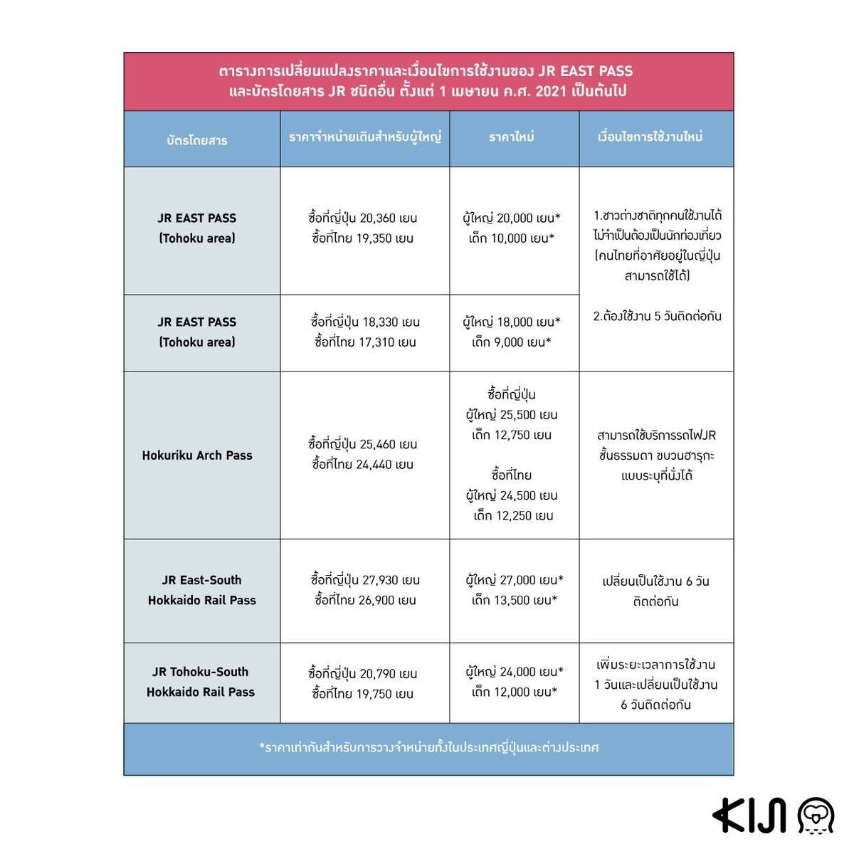 มีการปรับ ราคา บัตรโดยสาร JR EAST PASS (Tohoku area), JR EAST PASS (Nagano-Niigata area) และ JR East-South Hokkaido Rail Pass มีการปรับราคาให้ถูกลง และจ่ายเท่ากันทั้งการซื้อในญี่ปุ่นและต่างประเทศ