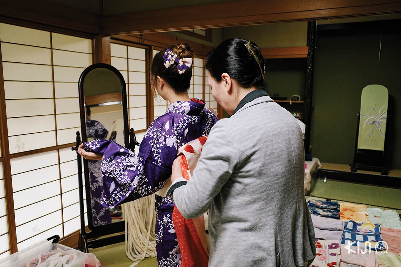 เที่ยวชมย่านโบราณทั้งที จะมีอะไรดีไปกว่าการใส่ยูกาตะเดินทอดน่องชมบรรยากาศ เราเดินตามหาร้านเช่าชุดตามเส้นถนนก็พบกับร้านทาเท็ตสึยะ (Tatetsuya) ด้านหน้าจะเป็นมุมขายของฝาก ด้านในมีบริการให้เช่าชุดยูกาตะ ซึ่งทางร้านจะให้เราเลือกลายผ้า กระเป๋า และเกี๊ยะที่ชอบ จากนั้นจะมีคนมาแต่งตัวทำผมให้เราเสร็จสรรพในราคา 4,000 เยน ความดีงามคือเช่าแล้วสามารถใส่ได้ทั้งวันเลย