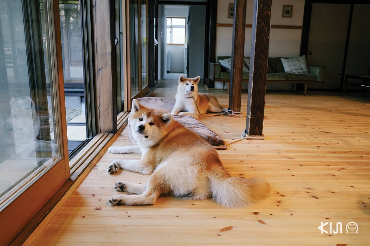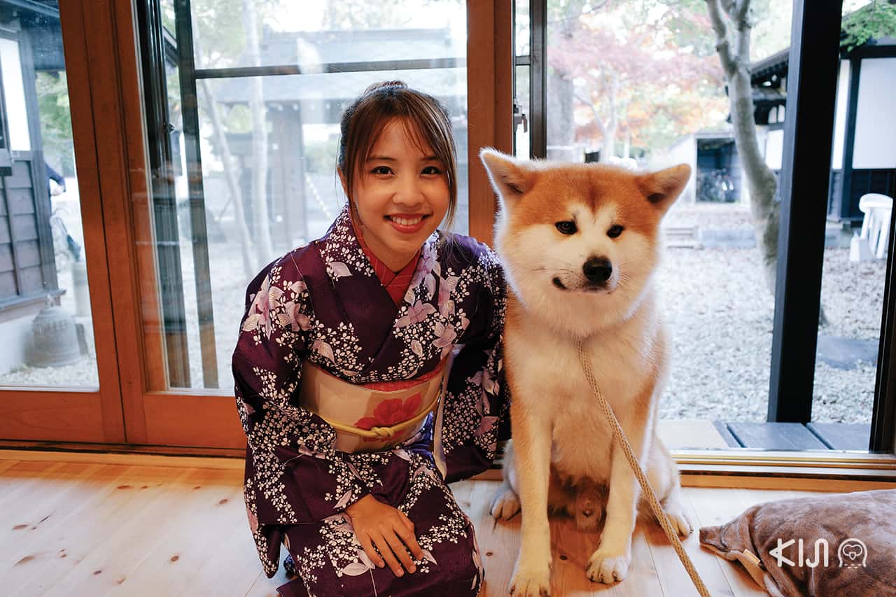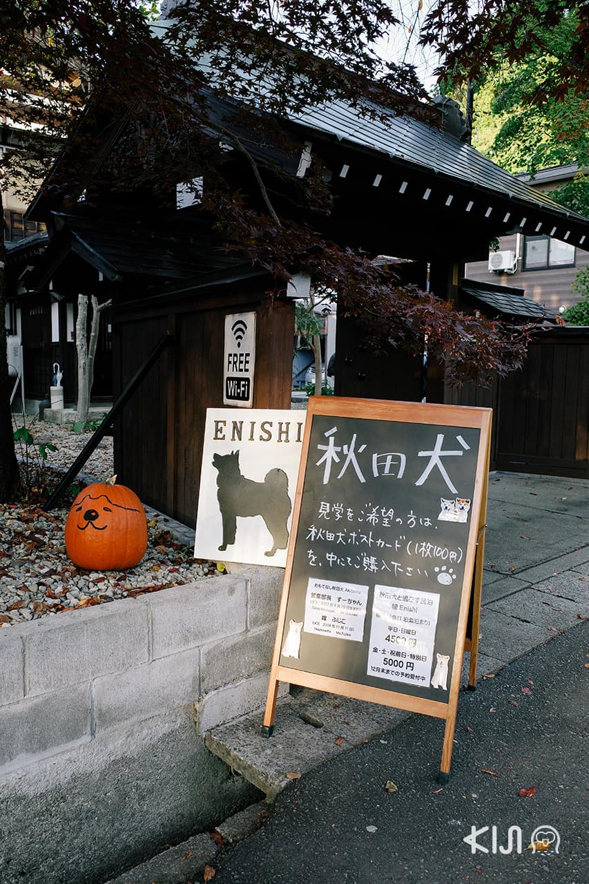 ปิดท้ายด้วยอีกหนึ่งสิ่งที่เราไม่คิดมาก่อนว่าจะได้เจอที่คาคุโนะดาเตะ เพราะอีกหนึ่งเหตุผลเล็กๆ ที่ทำให้ใจอ่อนอยากมาอาคิตะก็คือ อาคิตะอินุ สุนัขสายพันธุ์น่ารักมีต้นกำเนิดที่จังหวัดอาคิตะ เราเจอ Enishi เกสต์เฮาส์ขนาดกะทัดรัดแห่งหนึ่งในย่านคาคุโนะดาเตะที่เปิดให้เข้าไปเล่นกับอาคิตะอินุหนุ่มสาวชื่อว่า “เจ้าสุจัง” กับ “เจ้าฟุจิโกะ” ที่เจ้าของเลี้ยงไว้ได้ แต่จำเป็นต้องซื้อโปสการ์ดน้องหมาเพียง 100 เยน ก็ได้สัมผัสอาคิตะอินุตัวเป็นๆ แถมไม่จำกัดเวลา ใครอยากเจออาคิตะอินุ ปักหมุดโลเคชั่นนี้ไว้เลย