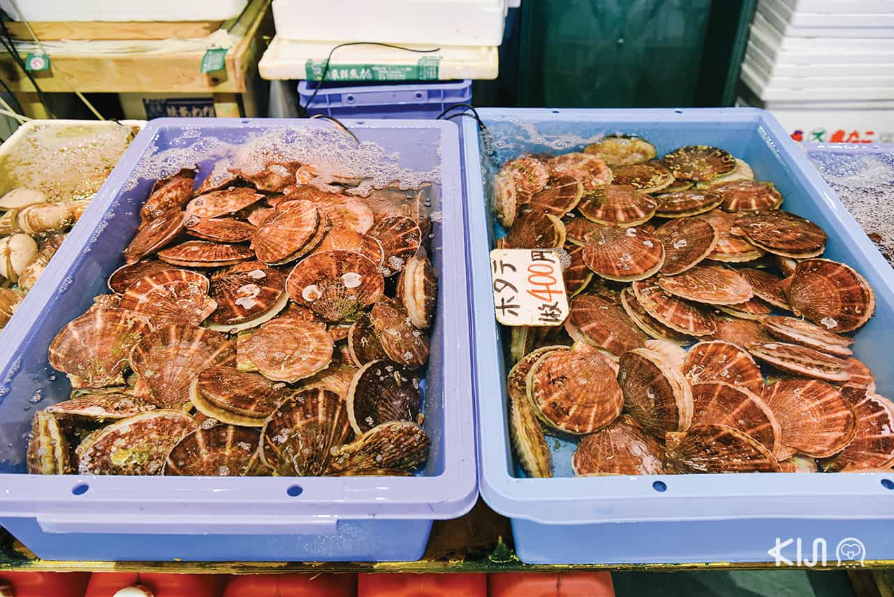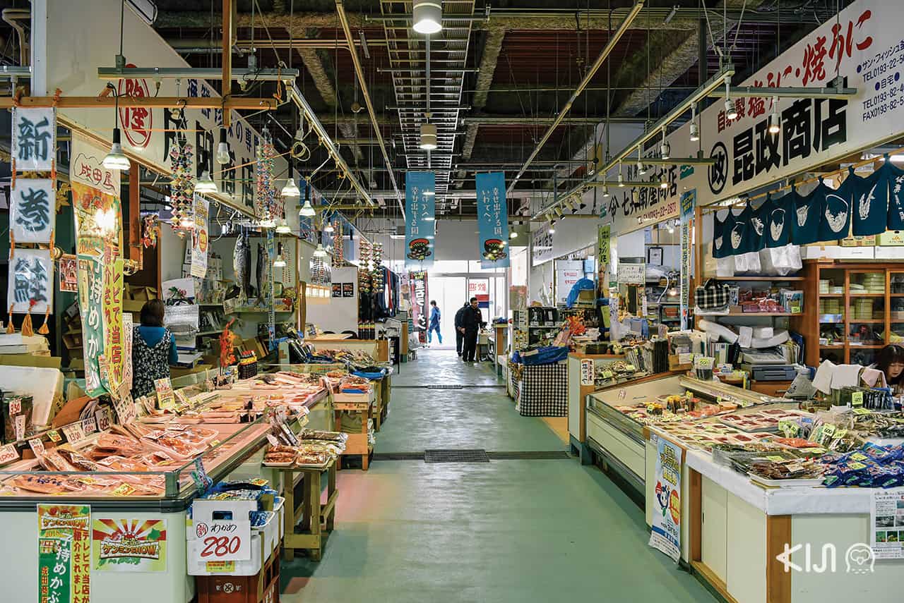 จากด้านหน้าสถานีรถไฟเรามองเห็นภาพปลาแสงอาทิตย์ตัวอ้วนที่ถูกสกรีนลงบนอาคารสองชั้นหลังหนึ่งชวนสะดุดตา จึงขอเข้าไปเดินสำรวจ ภายในให้บรรยากาศคล้ายตลาดสุดคึกคัก จำหน่ายอาหารทะเลสดๆ ให้เลือกซื้อหลากหลายชนิด และด้วยความที่เมืองคามาอิชิอยู่ติดชายฝั่งทะเล อาหารทะเลของที่นี่จึงอร่อยเป็นพิเศษ อีกทั้งที่ชั้น 2 มีร้านอาหารญี่ปุ่นที่รสชาติดีให้เลือกฝากท้องด้วย