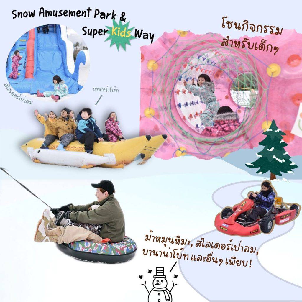 พาเด็กไปด้วยได้สบายๆ เพราะเค้ามีโซนมีกิจกรรมสำหรับเด็กเพียบเลย ทั้งม้าหมุนหิมะ, สไลเดอร์เป่าลม, บานาน่าโบ๊ท และเลื่อนหิมะ รับรองว่าเล่นได้แบบไม่มีเบื่อ