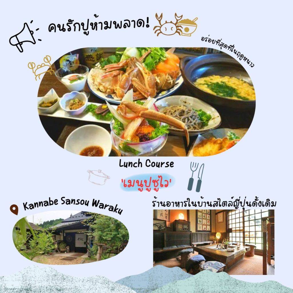 มาเที่ยวคันนาเบะช่วงฤดูหนาวจะพลาดไม่ได้เลยคือ ‘ปูซูไว’ ช่วงนี้เนื้อฉ่ำ หวานอร่อย และสดมากกก แนะนำที่ Waraku ร้านอาหารในบ้านสไตล์ญี่ปุ่นดั้งเดิม ที่นี่เขามีคอร์สปูซูไวเสิร์ฟเมนูจากปูหลากหลาย เช่น หม้อไฟ โซบะ ข้าวต้ม เป็นต้น เนื้อปูซูไวกับหม้อไฟร้อนๆ คือความสุขของวันอากาศหนาวจริงๆ