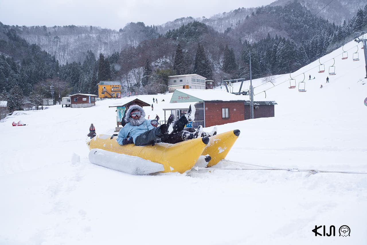 คิดว่ากิจกรรมจะหมดแค่นี้เหรอครับ ผมบอกเลยว่ายังมีอีกเยอะมาก เพราะผมกำลังจะพาไปอีกหนึ่งสกีรีสอร์ทในคันนาเบะที่มีชื่อว่า Oku Kannabe หรือ Okukan สามารถเล่นสกีและสโนว์บอร์ดที่นี่ได้ แต่ไฮไลท์ของ Okukan ที่ผมไม่อยากให้คุณพลาดก็คือ “Banana Ski” ถ้าเทียบกับบ้านเราก็คล้าย Banana Boat ที่แล่นบนน้ำทะเลนั่นแหละครับ แต่ที่มันพิเศษกว่าก็เพราะว่ามันวิ่งบนพื้นที่มีหิมะขาวปกคลุมนุ่มๆ นี่แหละ ซึ่งถ้าพร้อมแล้วก็มาเปลี่ยนความหนาวเป็นความตื่นเต้นกันเลย!
