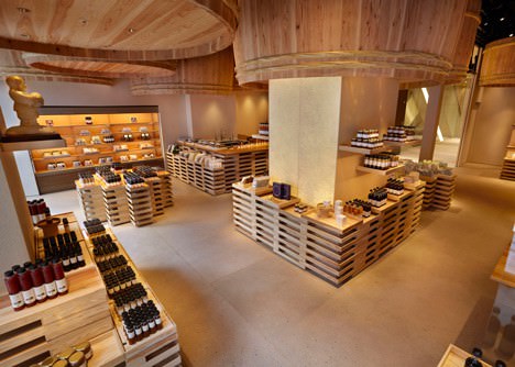 เบื้องล่างทำด้วยไม้ทั้งหมด ด้านการจัดวางผลิตภัณฑ์ของร้าน ถูกวางบนชั้นไม้ ไม่ต่างจากช็อปแบรนด์แฟชั่นชั้นนำเลย ลูกค้าสามารถเดินชมสินค้าในร้านไปพร้อมกับเสพศิลปะการตกแต่งของเคนโกะ คุมะ