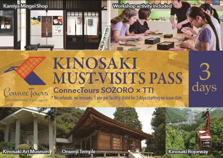Kinosaki Must-Visits Pass เป็นพาสใหม่ล่าสุดจากคิโนะซากิออนเซ็นที่รวมทุกกิจกรรมยอดนิยมเอาไว้ในบัตรเดียว ตัวบัตรใช้ได้ถึง 3 วัน สามารถซื้อออนไลน์ผ่านเว็บไซต์ visitkinosaki.com หรือ klook.com รวมถึงซื้อแบบวอล์คอินได้ที่ SOZORO Tourist Information Center ใกล้กับสถานีรถไฟคิโนะซากิออนเซ็น (Kinosakionsen Station) โดยมีราคาอยู่ที่ใบละ 2,500 เยน ซึ่งอัตราเงินสกุลบาทจะเปลี่ยนไปตามช่วงเวลา ณ ขณะนั้น