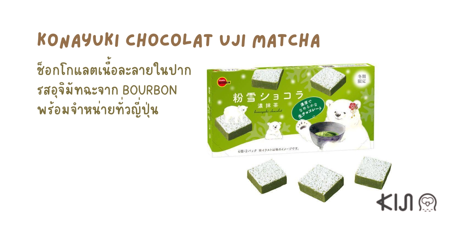 Konayuki Chocolat Uji Matcha สินค้าใหม่ล่าสุดของ Konayuki Chocolat ซีรีส์ช็อกโกแลตยอดนิยมจาก BOURBON รสชาติพิเศษวางจำหน่ายเฉพาะฤดูหนาว ช็อกโกแลตแท้เนื้อละลายในปากที่มีส่วนผสมของครีมเข้มข้นผสานเข้ากับรสชาติล้ำลึกของอุจิมัทฉะที่สามารถลิ้มรสพร้อมกันได้ในคำเดียว ในแพ็กเกจกล่องสีเขียวลวดลายหมีขาวแม่ลูกท่ามกลางบรรยากาศหิมะโปรยปรายที่ชวนให้นึกถึงฤดูหนาวสุดพิเศษ ราคาประมาณ 220 เยน (ไม่รวมภาษี) เริ่มวางจำหน่ายตั้งแต่วันที่ 12 มกราคม ถึง เดือนกุมภาพันธ์ ค.ศ. 2020 ในร้านสะดวกซื้อทั่วประเทศญี่ปุ่น