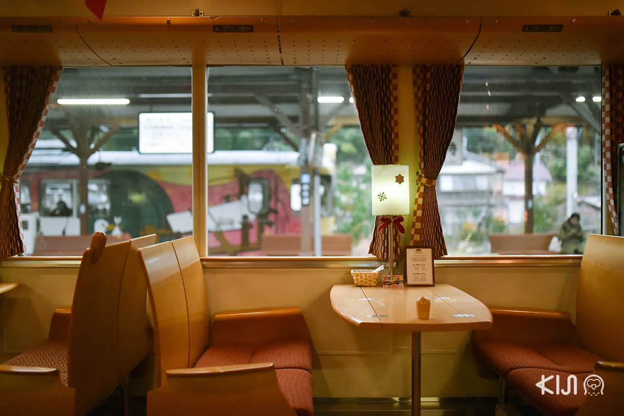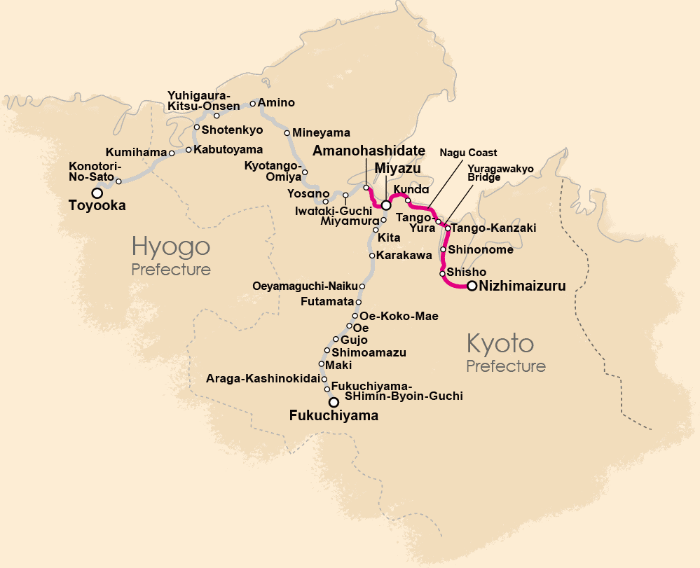 ส่วนขบวนรถไฟที่เราจะพาผู้อ่านไปขึ้นกันจริงๆ ก็คือสาย Aka-matsu (ต้นสนสีแดง) ออกเดินทางจากสถานีอามาโนะฮาชิดาเตะ (Amanohashidate Station) ไปสถานีนิชิมัยสุรุ (Nishimaizuru Station) ใช้เวลาเดินทาง 1 ชั่วโมง ไม่สั้นเกินไปและไม่ยาวเกินไป ขบวนนี้จึงไม่มีอาหารให้บริการ แต่สามารถเลือกเครื่องดื่มได้ฟรีหนึ่งอย่าง รถไฟขบวนพิเศษนี้วิ่งช้ากว่ารถไฟปกติเล็กน้อย เพื่อให้เราสามารถชื่นชมข้างทางได้ทัน