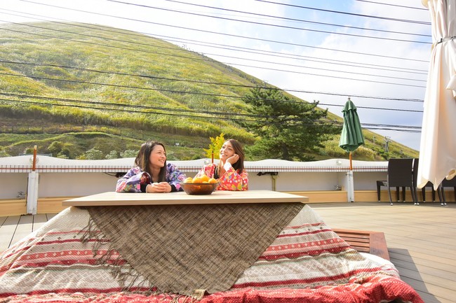 นอกจากบ่อแช่ออนเซ็นเท้าแล้ว ที่นั่งนอกระเบียงยังมีโต๊ะอุ่นขาสไตล์ญี่ปุ่น (Kotatsu) ให้นั่งอีกด้วย ยิ่งถ้าอากาศหนาวๆ บอกได้เลยว่าฟินมาก พิเศษสุดๆ กับเมนูอาหารและของหวานที่จำหน่ายเฉพาะฤดูหนาว สามารถสั่งได้เฉพาะที่นั่งนอกระเบียงเท่านั้น ไม่ว่าจะเป็น หม้อไฟ อุด้ง แกงกะหรี่ หมูทอดชีส เซ็ตดังโงะย่างพร้อมชาเขียวญี่ปุ่น เป็นต้น ได้กินอาหารจานร้อนปรุงสุกใหม่แบบนี้ คงช่วยคลายหนาวได้ดีทีเดียว