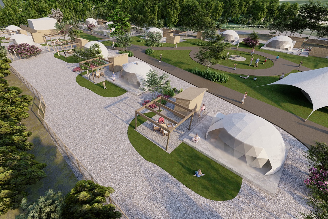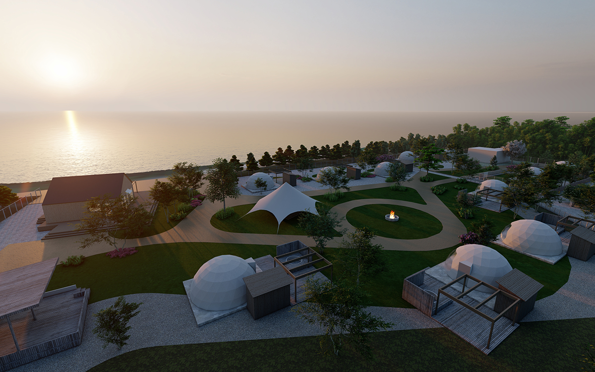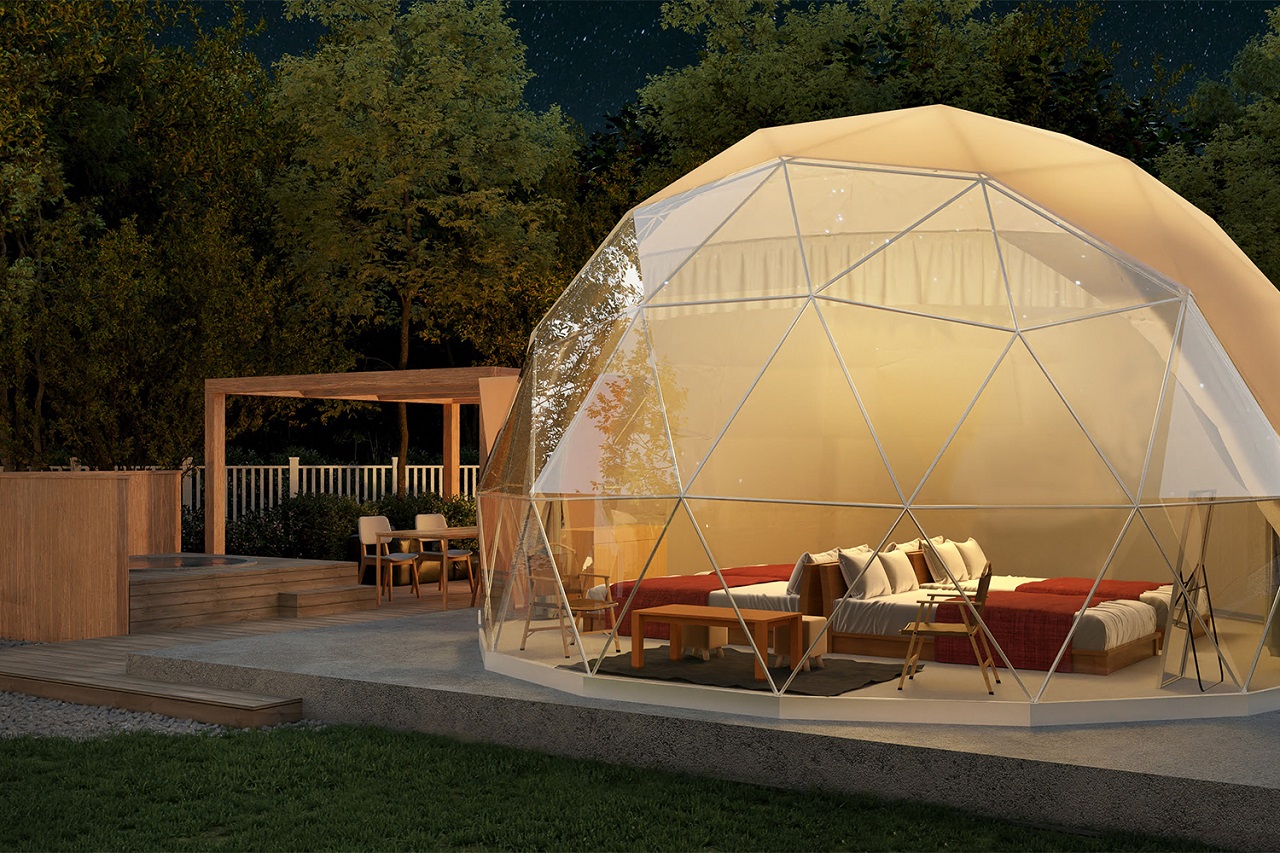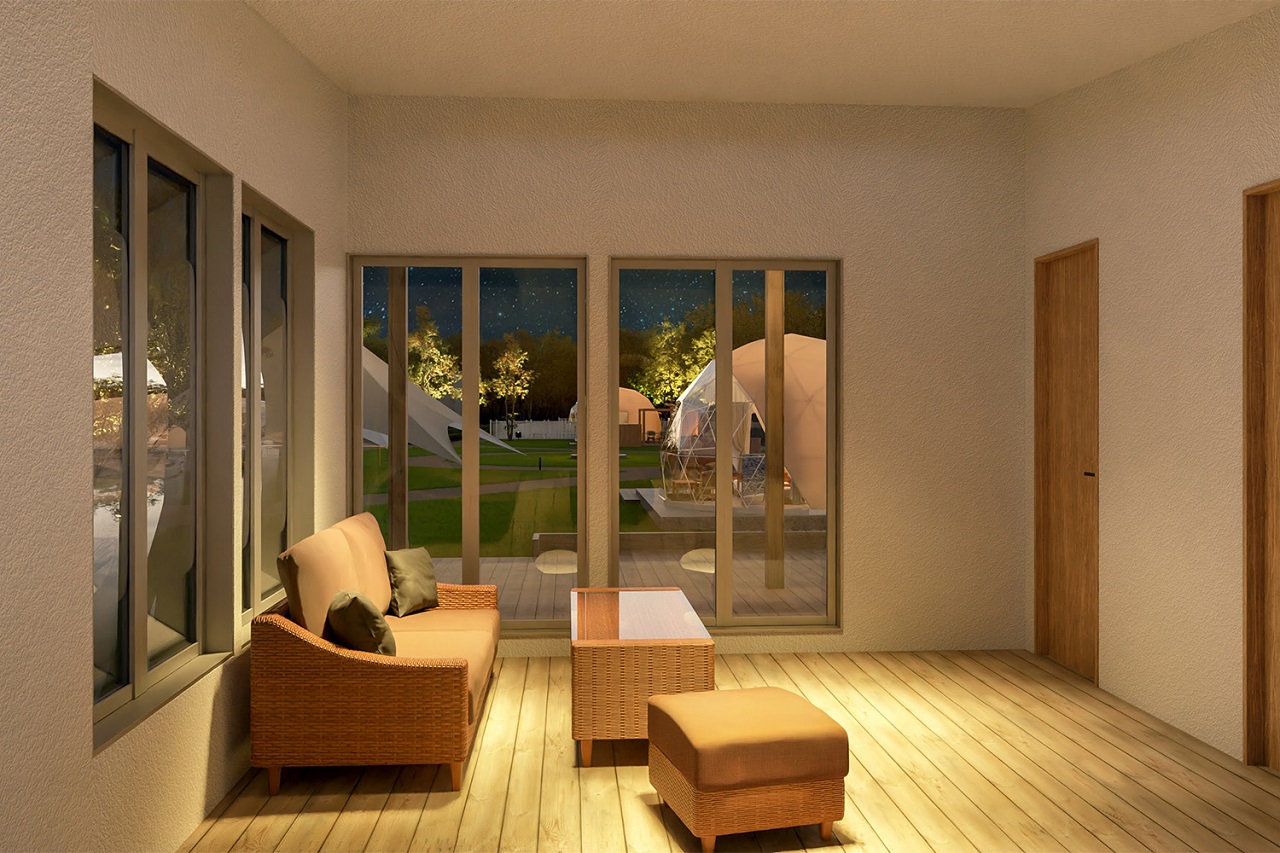 ห้องพักแกลมปิ้งสุดอลังการของที่นี่จะมีอยู่ทั้งหมด 12 หลัง เป็นห้องพักโดมเต็นท์แห่งแรกของญี่ปุ่นที่เป็นไปตามกฎหมายว่าด้วยมาตรฐานอาคาร จึงมีความปลอดภัยสูงมาก มีทั้งหมด 11 หลัง แบ่งออกเป็น 3 รูปแบบ มีพื้นที่รับประทานอาหารส่วนตัว ห้องสุขาและห้องอาบน้ำฝักบัวส่วนตัวในที่พักทุกแบบ และโดมเต็นท์จะมีขนาดเท่ากันทั้งหมดทุกแบบ มีขนาดเส้นผ่านศูนย์กลาง 6 เมตร (พื้นภายใน 28 ตารางเมตร) และห้องพักแบบวิลล่าอีก 1 หลัง