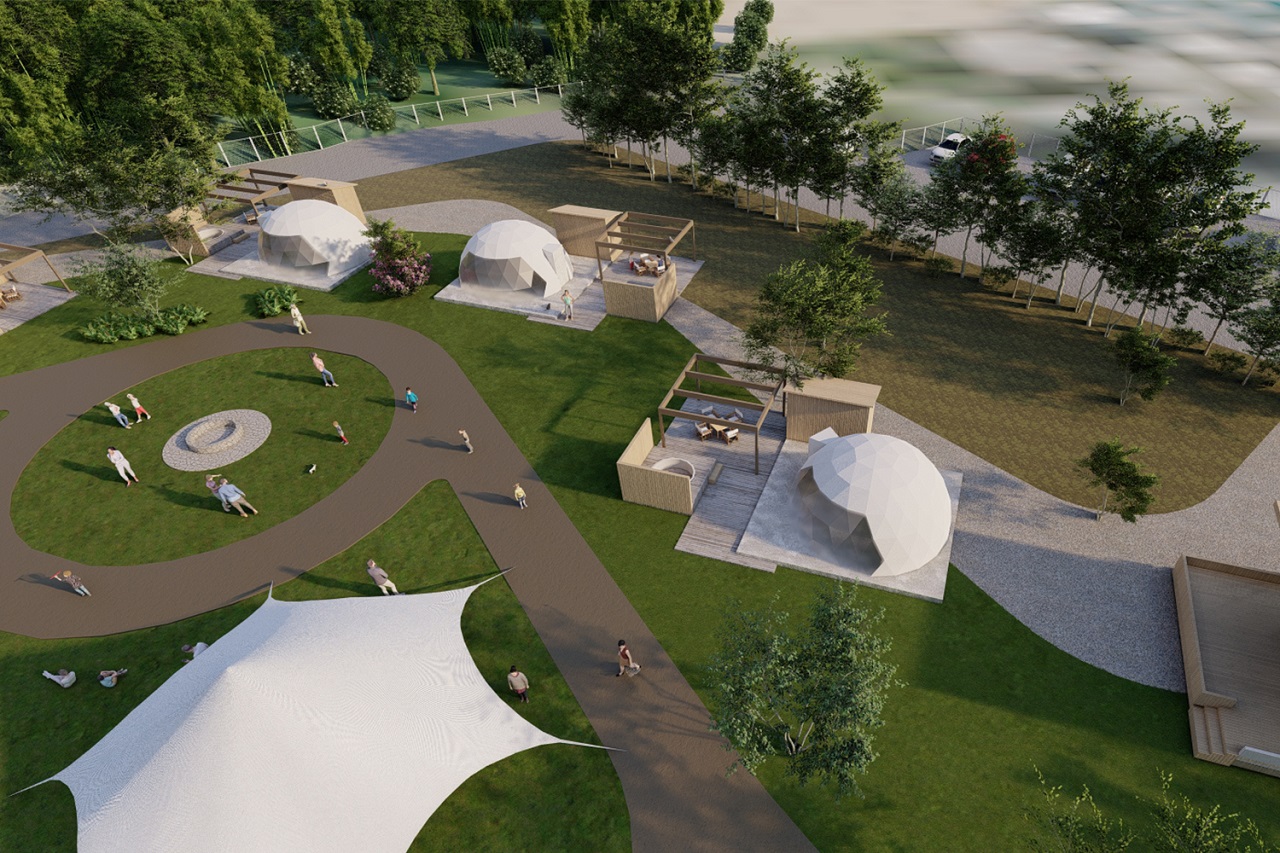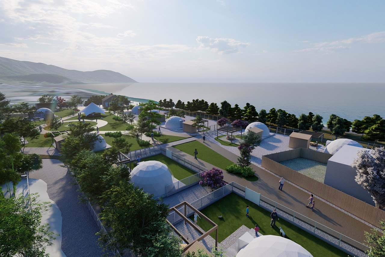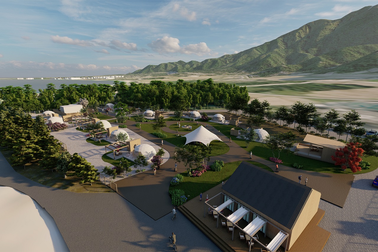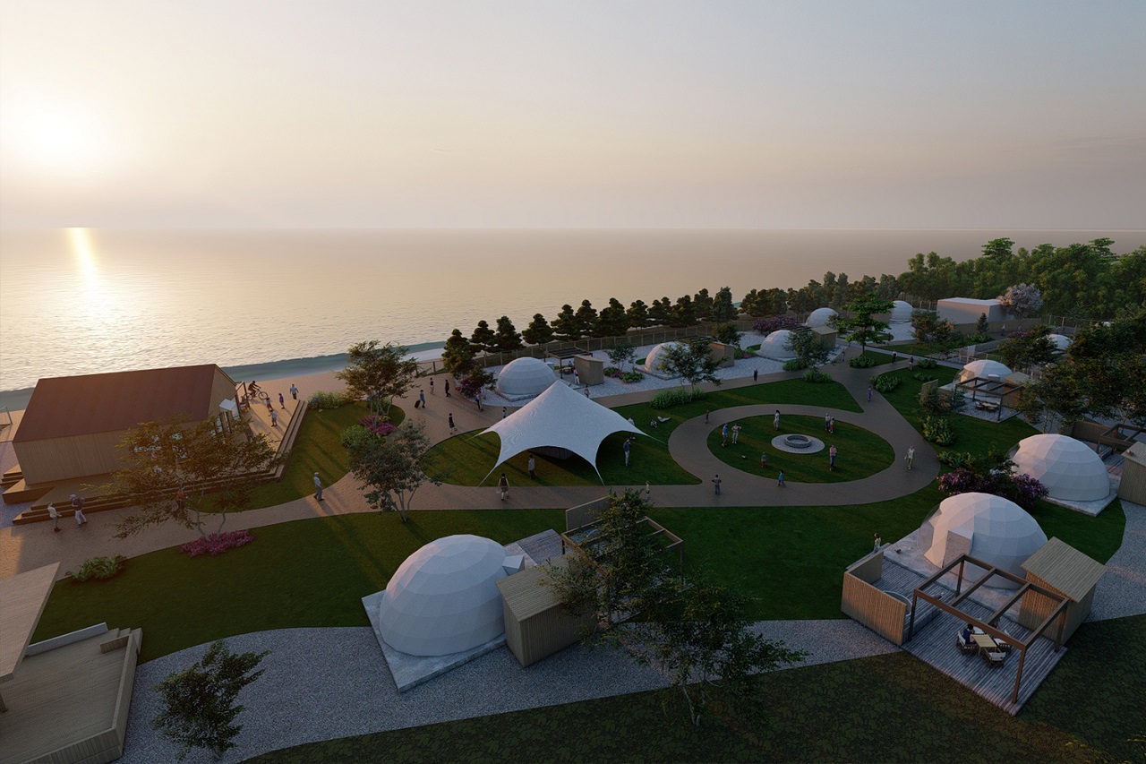 ห้องพักแกลมปิ้งสุดอลังการของที่นี่จะมีอยู่ทั้งหมด 12 หลัง เป็นห้องพักโดมเต็นท์แห่งแรกของญี่ปุ่นที่เป็นไปตามกฎหมายว่าด้วยมาตรฐานอาคาร จึงมีความปลอดภัยสูงมาก มีทั้งหมด 11 หลัง แบ่งออกเป็น 3 รูปแบบ มีพื้นที่รับประทานอาหารส่วนตัว ห้องสุขาและห้องอาบน้ำฝักบัวส่วนตัวในที่พักทุกแบบ และโดมเต็นท์จะมีขนาดเท่ากันทั้งหมดทุกแบบ มีขนาดเส้นผ่านศูนย์กลาง 6 เมตร (พื้นภายใน 28 ตารางเมตร) และห้องพักแบบวิลล่าอีก 1 หลัง