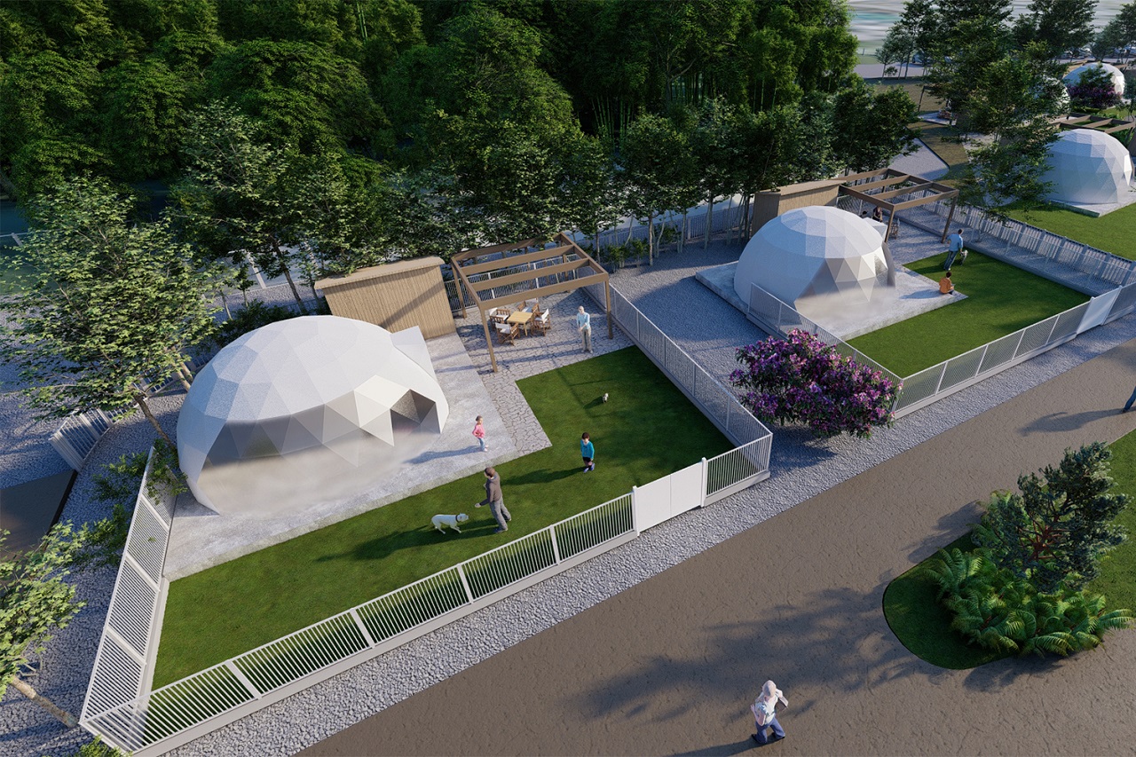 โดมนี้เราขอแนะนำสำหรับคนที่อยากพาสัตว์เลี้ยงที่น่ารักมาเข้าพักด้วย เพราะห้องพักแบบด็อกรันโดมจะมีสนามหญ้าและรั้วกั้นเพิ่มเข้ามา เพื่อเพิ่มและจำกัดพื้นที่ให้สัตว์เลี้ยง ภายในเต็นท์จะมีเตียงเดี่ยว 4 เตียง เข้าพักได้ 4 คน มีเพียงแค่ 2 หลังเท่านั้น