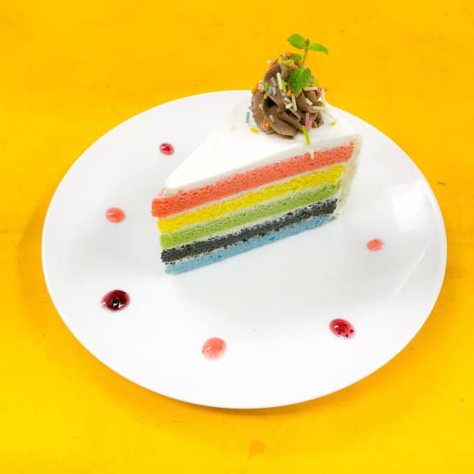 ความโดดเด่นของเมนูที่ทางร้านรังสรรค์ขึ้นมาก็คือ หน้าตาที่ดูน่ารับประทาน ทันทีที่พนักงานมาเสิร์ฟบนโต๊ะเป็นอันต้องรีบควักโทรศัพท์มือถือมาแชะแชร์โดยไม่รีรอ โดยหนึ่งในเมนูที่ทางร้านนำเสนอก็คือเค้กสีรุ้ง Pastel Color Cake (698 เยน)