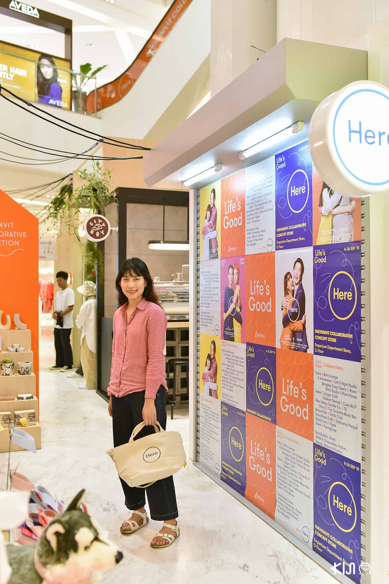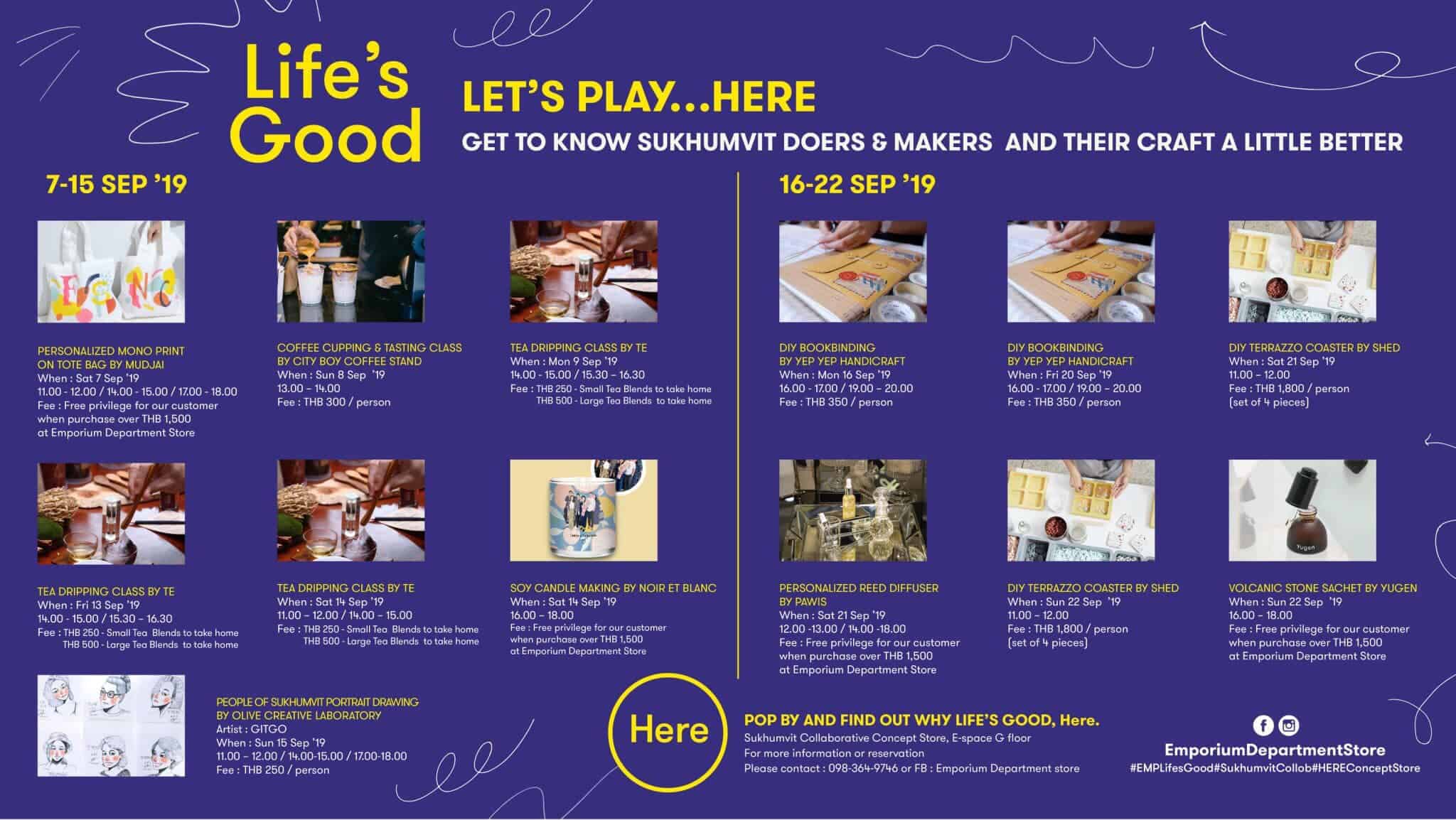 Life’s Good..Here เกิดขึ้นจากความร่วมมือของ Emporium Department Store ที่เกิดและเติบโตอยู่ในย่านสุขุมวิทมาตั้งแต่ปี ค.ศ. 1997 เห็นความเปลี่ยนแปลงมาตลอด รู้จักย่านนี้เป็นอย่างดี และต้องการเล่าสู่กันฟังว่า I’m here in Sukhumvit, Life’s good here ที่นี่คือสุขุมวิท เรามีความสุขและมีชีวิตดีๆ ผ่านทางผลิตภัณฑ์คุณภาพเยี่ยม สินค้าดีไซน์เก๋ เวิร์คช็อปน่าสนใจจากเจ้าของร้านค้าหลากหลายประเภทและหลากหลายเจเนอเรชั่นของย่านสุขุมวิท พร้อมทั้งมีการรวบรวมเอกลักษณ์ต่างๆ ที่บ่งบอกถึงความเป็นสุขุมวิทมาไว้ใน Here Concept Store ของห้างฯเอ็มโพเรียมพื้นที่เดียว เรียกได้ว่ามาที่เดียวเที่ยวได้ทั้งสุขุมวิท