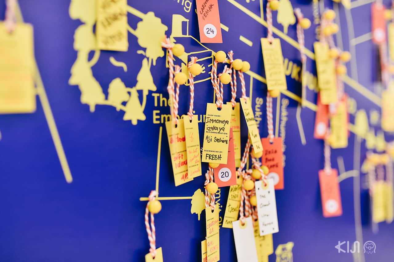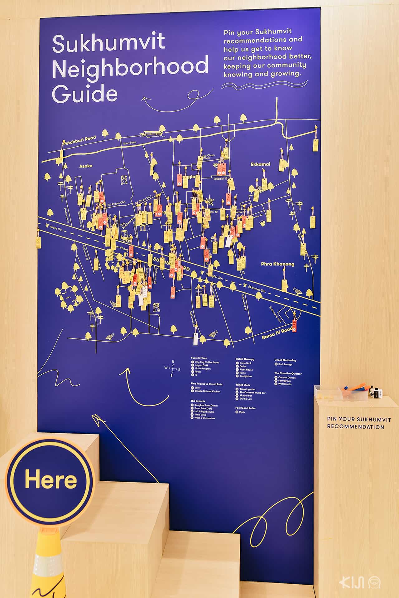 ขอปิดท้ายด้วยพื้นที่เล็กๆ ติดผนัง ที่เปิดโอกาสให้ใครก็ตามที่มีความสุขกับย่านสุขุมวิทและอยากบอกต่อถึงความดีงาม ความเก๋ ความเท่ของอะไรก็ตาม ไม่ว่าจะเป็นร้านอาหาร คาเฟ่ แหล่งสร้างสรรค์อื่นๆ ก็สามารถมาปักหมุดแบ่งปันกันได้ เราชอบไอเดียนี้มาก เหมือนเป็นการให้ทุกคนมีส่วนร่วมและทำให้เราได้สัมผัสย่านสุขุมวิทอย่างเพลิดเพลินได้อีกทางหนึ่ง
