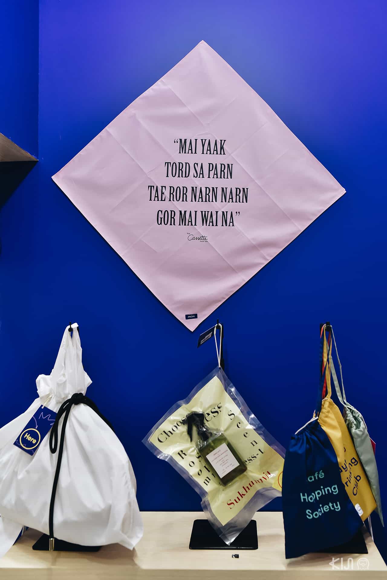 The Cassette Music Bar x Onion แหล่งแฮงเอาท์ตรงปากซอยเอกมัย 10 ที่เปิดเฉพาะเพลงเก่าเอาใจวัยรุ่น 90s ร่วมมือกับมัลติสโตร์ที่คอยคัดสรรแฟชั่นเสื้อผ้าเครื่องประดับดีมีสไตล์มาอัพเดทอยู่เสมอที่ซอยเอกมัย 12 เลือกออกแบบไอเท็มผ้าที่ใส่เนื้อเพลง “ผ้าเช็ดหน้า” ของวง Triumphs Kingdom เอามาโพกหัวก็เก๋ไม่เบา และเสื้อยืดลาย “พร้อมพงษ์” ก็สกรีนขึ้นพิเศษเฉพาะงานนี้