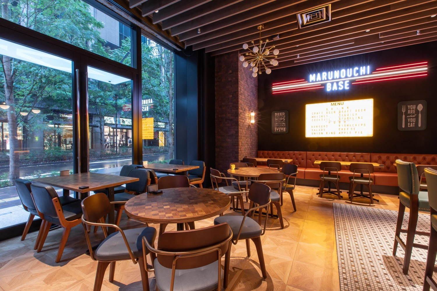 MARUNOUCHI BASE สถานบันเทิงขนาดใหญ่ที่เชื่อมต่ออาหารและความสนุกเข้าด้วยกัน ตั้งอยู่บริเวณชั้น 1 และชั้น 2 โดยเราสามารถเพลิดเพลินกับมื้ออาหารในบรรยากาศเรโทรป๊อปที่มีทั้งที่นั่งแบบโต๊ะธรรมดาและเเบบเคาน์เตอร์ได้ที่ชั้น 1 ส่วนใครที่ชอบอิ่มอร่อยกับมื้ออาหารเคล้าบรรยากาศแสงสีเสียงให้ไปยังชั้น 2 พื้นที่ความสนุกครบรูปแบบ ทั้งเกมปาเป้า ปิงปอง และห้องคาราโอเกะแห่งแรกของมารุโนะอุจิ