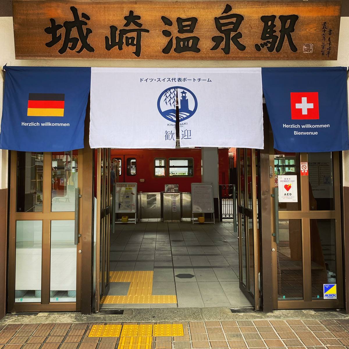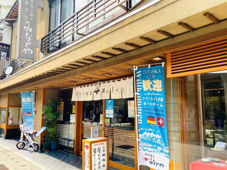 ความน่ารักของชาวโทโยโอกะนั้นสัมผัสได้ตั้งแต่ลงรถไฟมาที่สถานีคิโนะซากิออนเซ็น (Kinosakionsen Station) เพราะมีการแขวนป้ายธงชาติพร้อมข้อความ “ยินดีต้อนรับ” เป็นภาษาเยอรมันและฝรั่งเศส ไม่เพียงเท่านั้นร้านรวงต่างๆ ก็มีการตั้งป้ายต้อนรับทีมนักกีฬาเรือพายอย่างชัดเจน เชื่อว่าตอนนักกีฬาเดินทางมาถึงคงรู้สึกหายเหนื่อย เพราะได้รับการต้อนรับอันอบอุ่นเช่นนี้