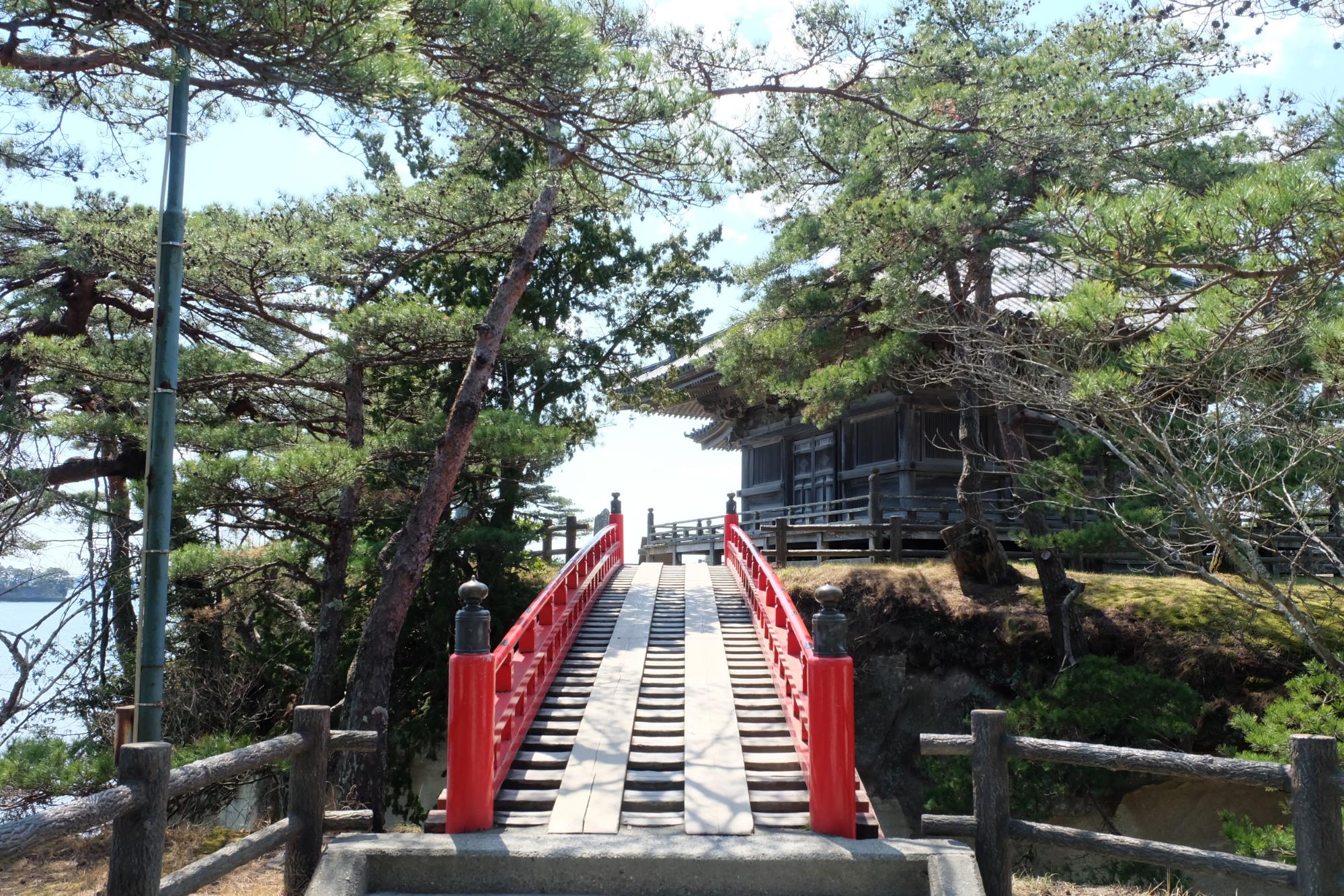 เพียงนั่งรถไฟ JR จากสถานีเซนได (Sendai Station) สายเซนเซกิ (Senseki Line) ประมาณ 40 นาทีมาลงที่สถานีมัตสึชิมะ ไคกัง (Matsushima Kaigan Station) เราก็เดินทางมาถึงมัตสึชิมะตามที่ตั้งใจ เราเดินตามทางเลียบริมทะเลไปจนถึง Sukashi Bridge สะพานสีแดงที่พาข้ามไปเกาะเล็กๆ กลางทะเล แม้จะมีต้นสนปกคลุม แต่ยังแอบเห็นสถาปัตยกรรมเก่าแก่ของญี่ปุ่นโผล่มาให้ชื่นชมจากระยะไกล อาคารไม้เก่าแก่หลังนี้คือวัดที่มีชื่อว่า Godaido