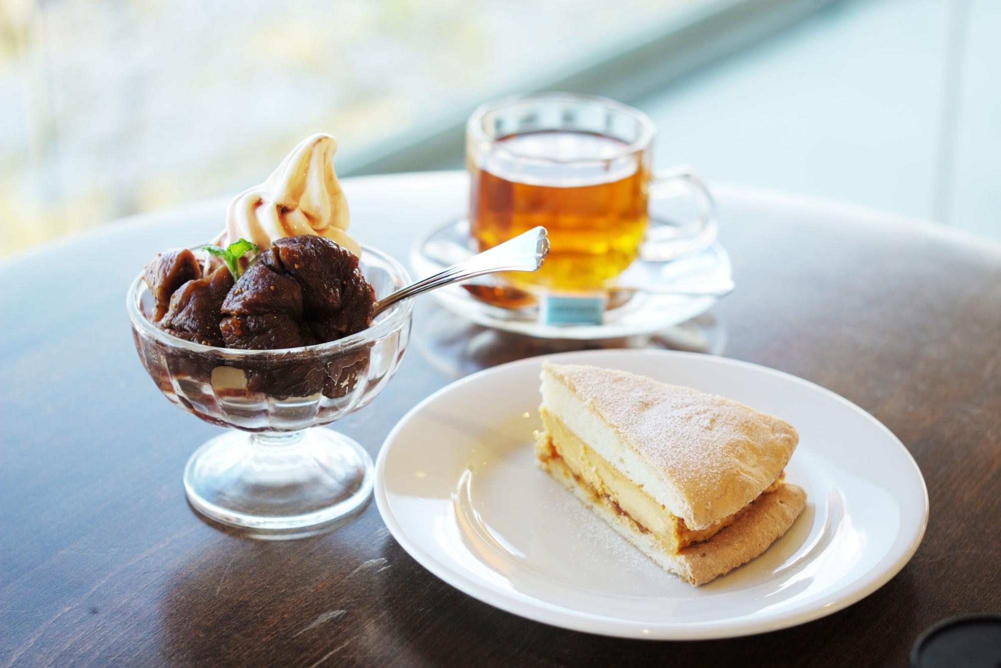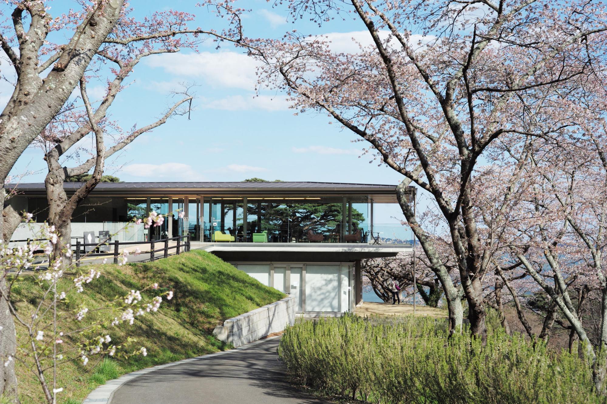 ร้านคาเฟ่ Café le Roman ตั้งอยู่บนเนินในสวน Saigyo Modoshi no Matsu Park จึงเป็นจุดที่เราสามารถชื่นชมวิวทั้งหมดที่ว่านี้อย่างพอเหมาะพอเจาะ ร้านดีไซน์เรียบเก๋เหมือนอยู่ในเมือง แต่กำแพงกระจกใสทั้งบานรอบด้านทำให้เรายังรู้สึกเชื่อมต่อกับธรรมชาติ เมนูอาหารและขนมที่นี่เป็นสไตล์ตะวันตก ชากาแฟมีครบ ฝากท้องของว่างยามบ่ายได้เลย