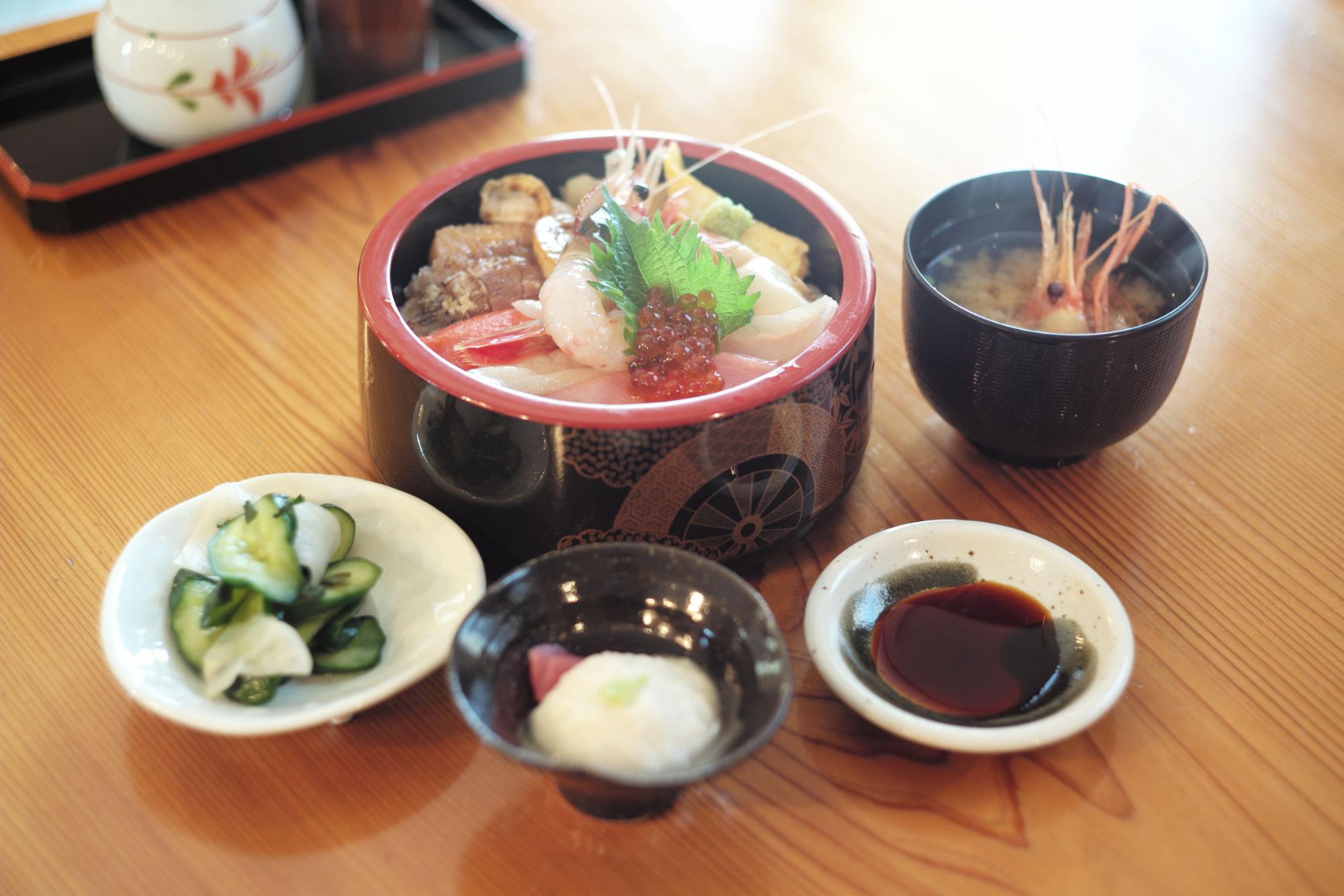 เราจะสั่งแบบแยกชิ้นก็ได้ แต่แนะนำว่าสั่งเป็นเซ็ตราคาจะย่อมเยากว่านิดหน่อย เราทดลองเซ็ตราคากลางๆ อย่าง Tokujou-onigiri (2,800 เยน) กับ Tokujou-kaizendon (2,900 เยน) ได้ลองชิมของทะเลหลากหลายและสดใหม่อร่อยพอดีๆ