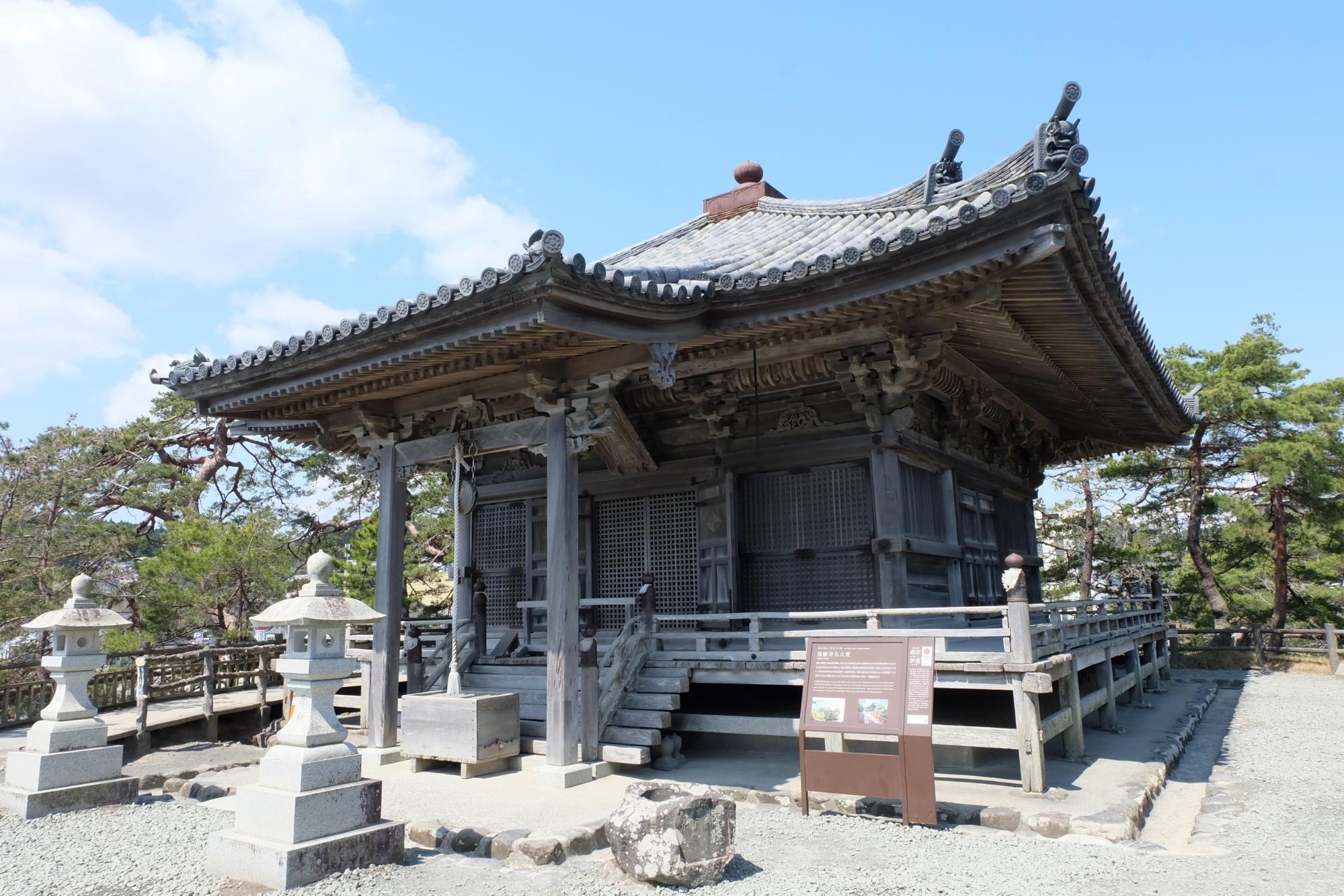 วัดนี้เป็นหนึ่งในสัญลักษณ์ของมัตสึชิมะก็ว่าได้ ก่อตั้งขึ้นตั้งแต่ปี ค.ศ. 1604 สร้างขึ้นเพื่อสักการะบูชากษัตริย์ผู้ยิ่งใหญ่ 5 พระองค์ซึ่งช่วยปกป้อง Zuiganji โดยพื้นที่ทั้งเหมาะของเกาะเล็กๆ นี้ถือว่าเป็นดินแดนศักดิ์สิทธิ์เชียวนะ ส่วนพระพุทธรูปด้านในอาคารนั้นจะเปิดให้ได้เห็นกันแค่ช่วงพิธีกรรมที่จัดทุกๆ 33 ปีเท่านั้น ชมความวิจิตรของอาคารเสร็จแล้วหันไปเจอวิวอ่าวยิ่งว้าวใหญ่ เพราะเราได้ยืนดูหมู่เกาะจากกลางทะเล ได้บรรยากาศไปอีกแบบ