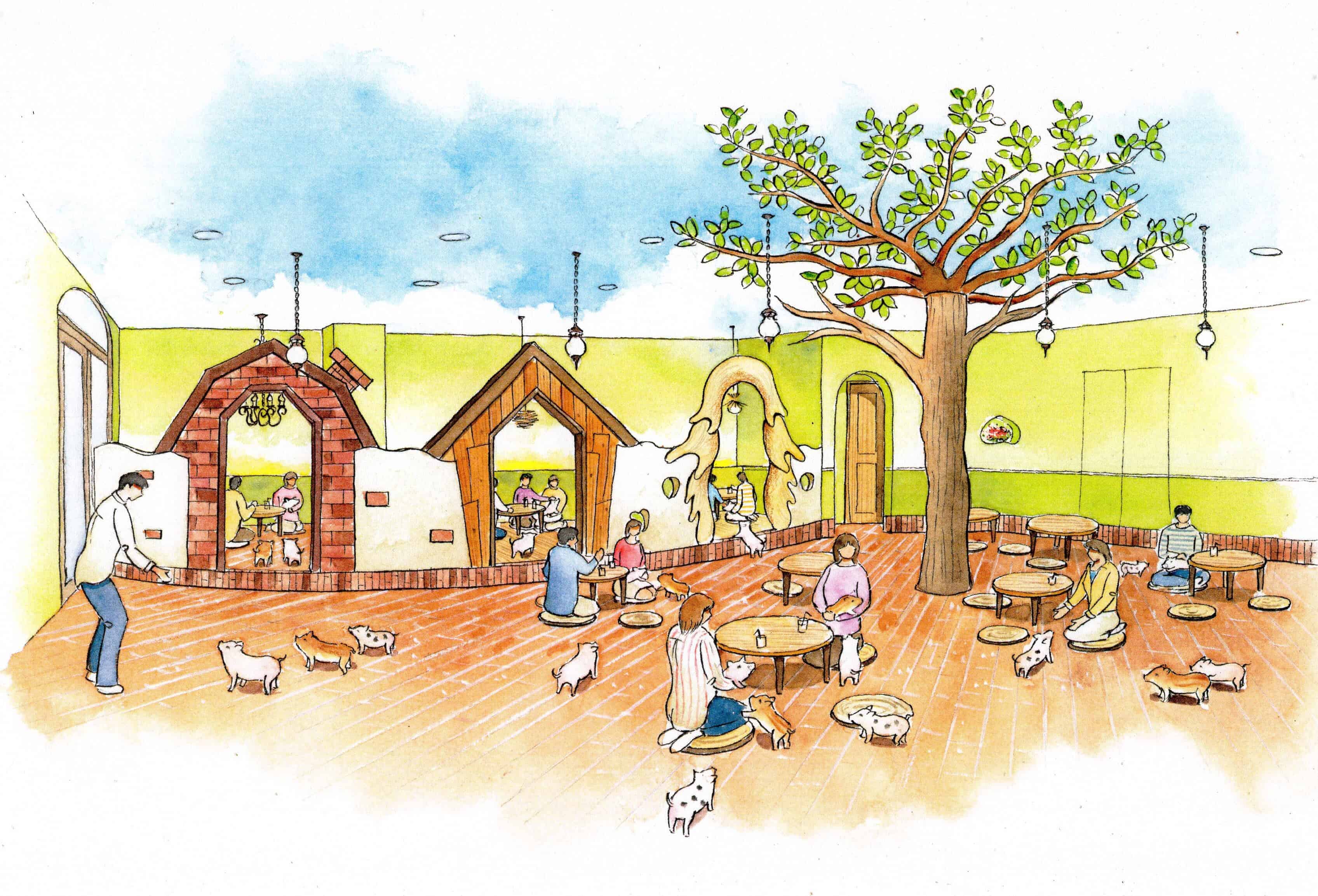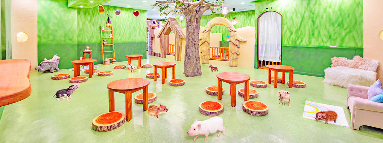 โดยคอนเซ็ปต์สุดน่ารักของที่นี่คือ บ้านของหมูแคระอันอบอุ่น คาเฟ่แห่งนี้เปิดให้ผู้ใช้บริการสามารถเล่นกับเจ้าหมูตัวจิ๋วได้ในราคา 1,000 เยนต่อ 30 นาที และต้องสั่งเครื่องดื่มอย่างน้อย 1 อย่าง (600 เยน) นอกจากเล่นกับเจ้าหมูแล้ว ที่นี่ยังสามารถซื้ออาหารเพื่อป้อนน้องหมูได้ ส่วนกฎของที่นี่ในการเล่นกับเจ้าหมูคือ ห้ามใช้แฟลชถ่ายภาพและต้องอุ้มเจ้าหมูน้อยเหล่านี้อย่างเบามือ